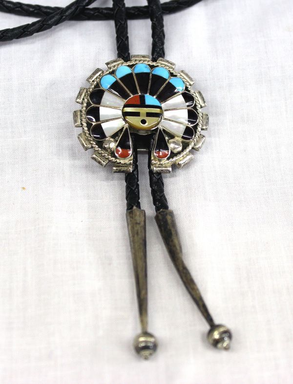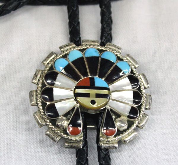 From the Collection of Nick and Suzanne Nicholas. Zuni Channel Inlay Sterling Silver Sun God Bolo, slide measures 1.5in in diameter, etched on the back reads Sterling Silver in cursive, sterling silver tips, features channel inlay of turquoise-mother of pearl-coral-tortoise shell, and jet, notched silver border, twisted rope and silver bead accents, 39mm braided cord, finely crafted in Zuni Pueblo tradition