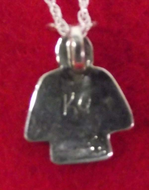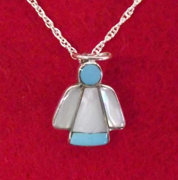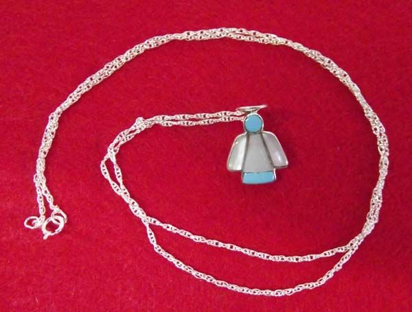 Native American Zuni Channel Inlay Sterling Turquoise Angel Pendant Necklace hallmarked KQ. She even has a sterling silver halo, sterling chain, turquoise and mother of pearl. Lovely piece.