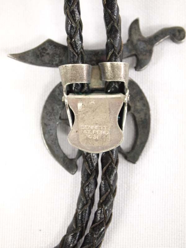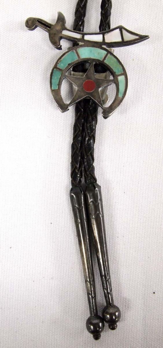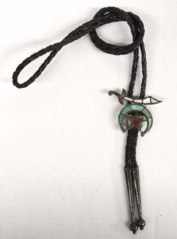 Native American Zuni Channel Inlay Turquoise & Mother of Pearl Shriner's Bolo Tie. Slide measures 1.75'' x 1.75''.