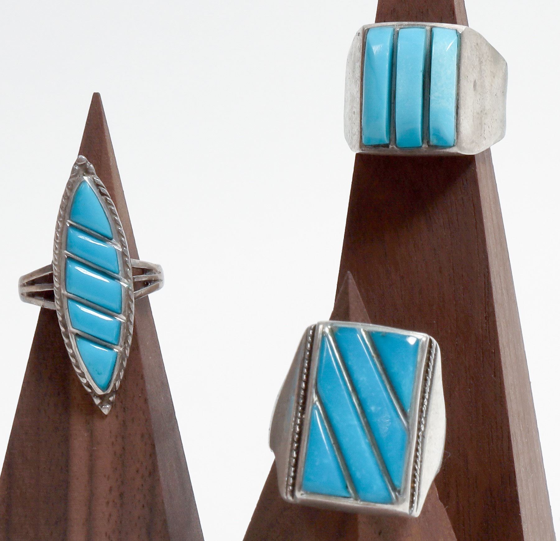 This group has three Zuni channel rings with beautiful blue channeled stones. Sizes range from: 6, 8, 10 1/2. Please see photo for details. [] [] [] [] []