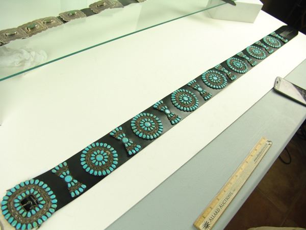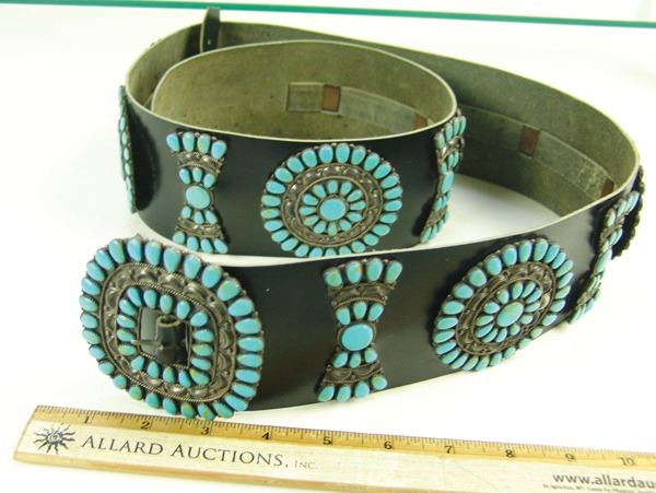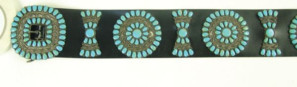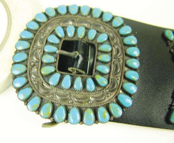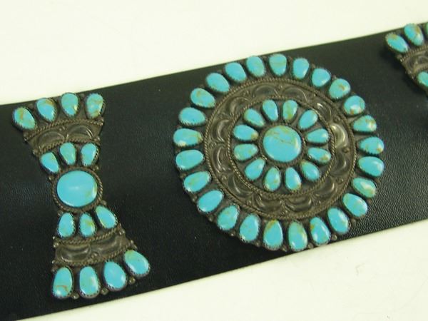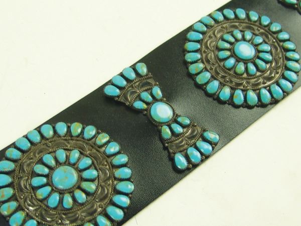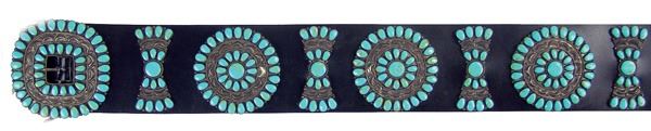 Beautiful, 3" wide turquoise and silver concho belt with matching rosette conchos, butterfly spacers, and squared buckle all done in popular cluster design. Very good condition.Ca. 1980sFits up to 46"