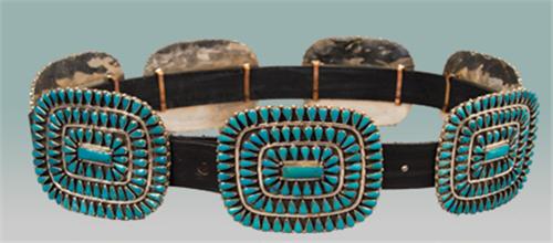 Zuni Concho Belt. 43" long black belt. Six sterling conchos and one belt buckle. 4" x 4 1/2" conchos set with hundreds of fine pieces of turquoise. Excellent condition. (est $3,000-4,000)