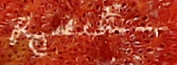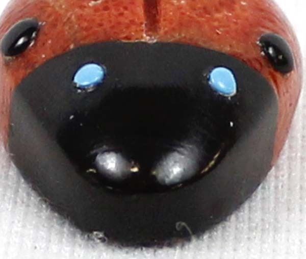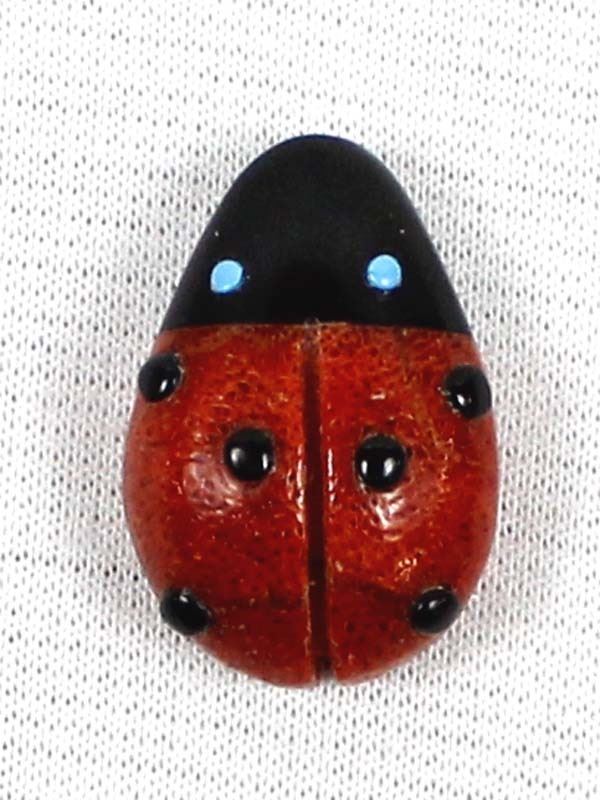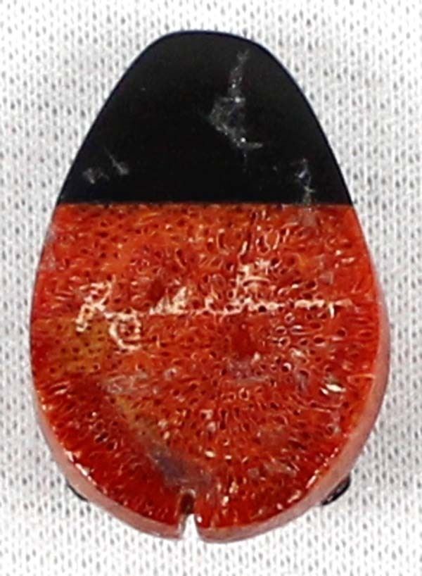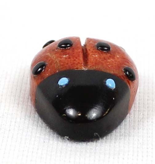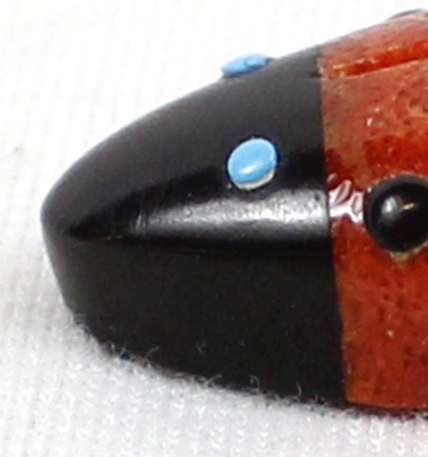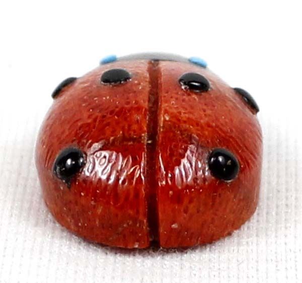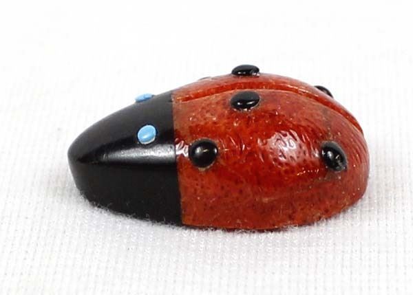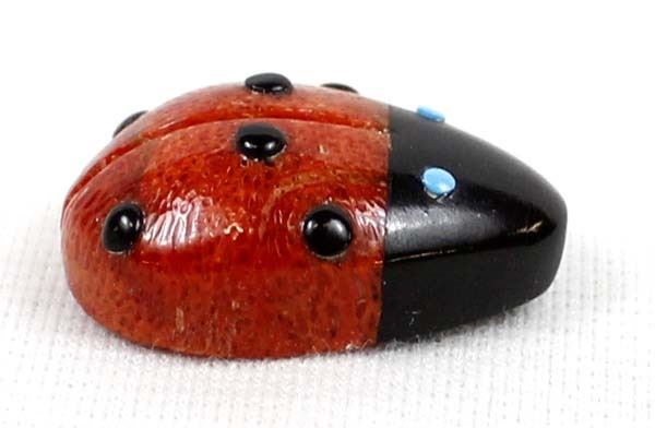 Native American Zuni Coral & Black Marble Ladybug Fetish by Georgia Quandelacy, measures 7/8''L x 5/8''W and is signed on the bottom