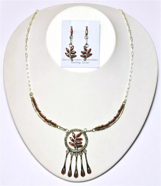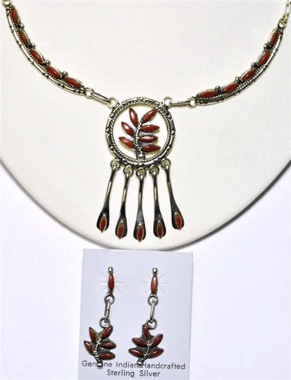 Zuni Coral Hanger Pendant Necklace & Earrings Set