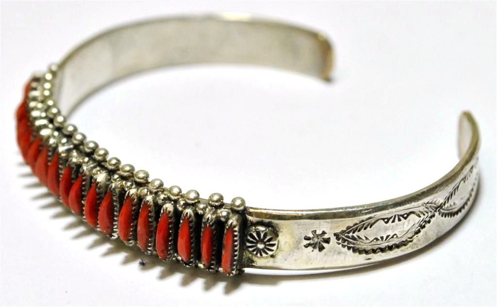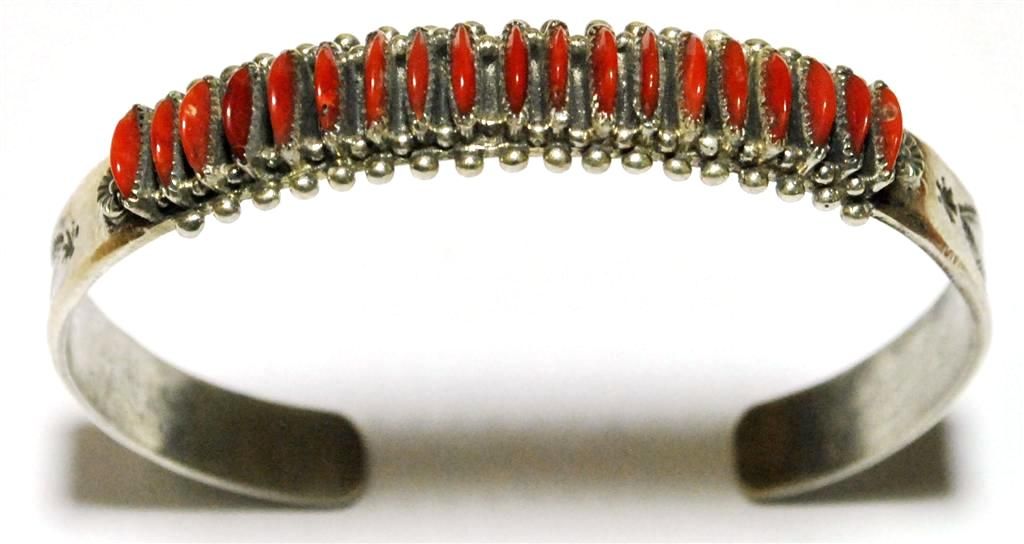 Zuni Coral Needlepoint Sterling Silver Cuff Bracelet