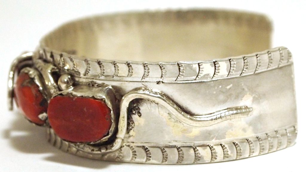 Zuni Coral Sterling Silver Snake with Turquoise Eyes Cuff Bracelet - Effie Calavaza