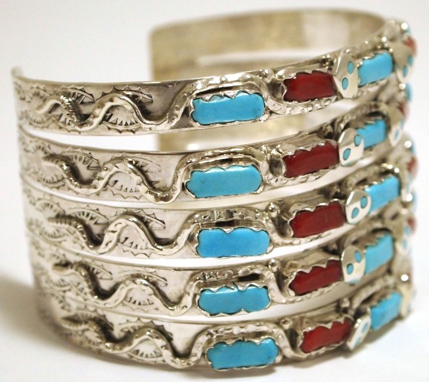 Zuni Coral & Turquoise Sterling Silver 5-Row Snake Cuff Bracelet - Effie Calavaza