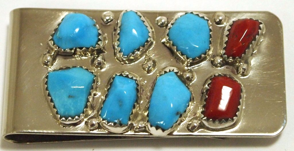 Zuni Coral & Turquoise Sterling Silver Money Clip - Curt Cheama