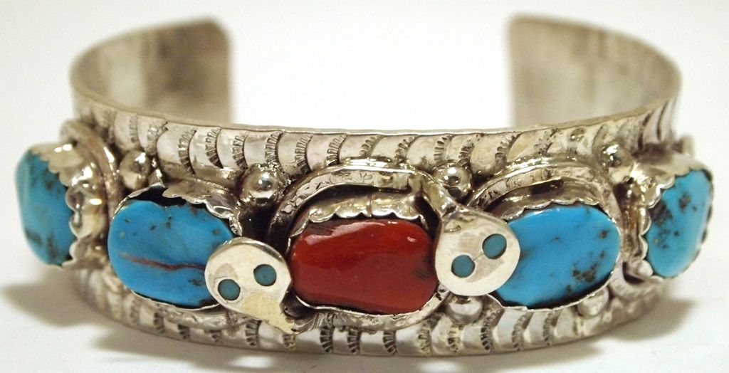 Zuni Coral & Turquoise Sterling Silver Snake Cuff Bracelet - Effie Calavaza