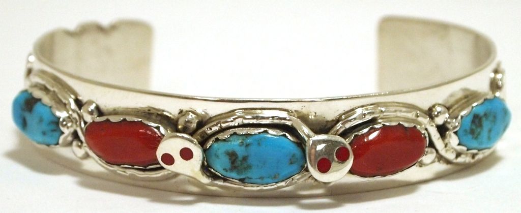 Zuni Coral & Turquoise Sterling Silver Snake Cuff Bracelet - Effie Calavaza