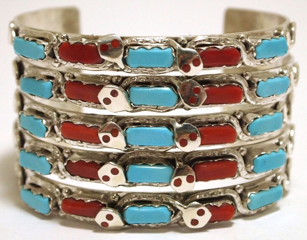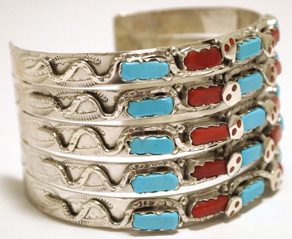 Zuni Coral & Turquoise Sterling Silver Snake Cuff Bracelet - Effie Calavaza