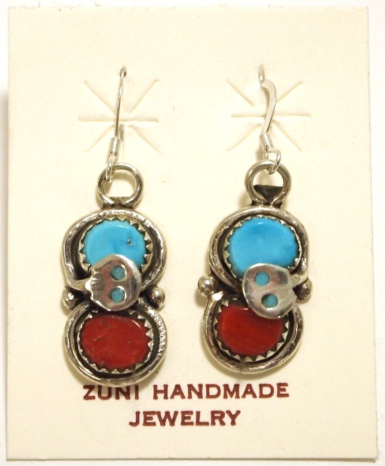 Zuni Coral & Turquoise Sterling Silver Snake French Hook Earrings - Effie Calavaza