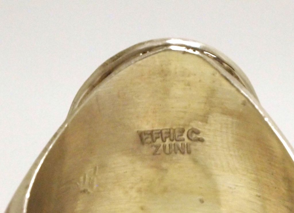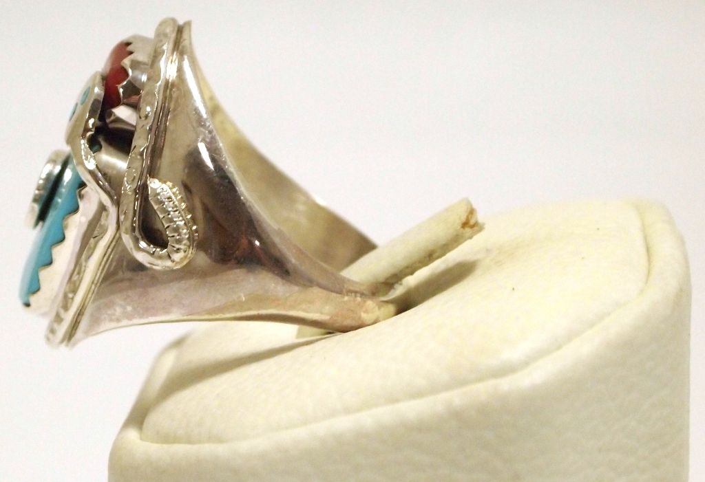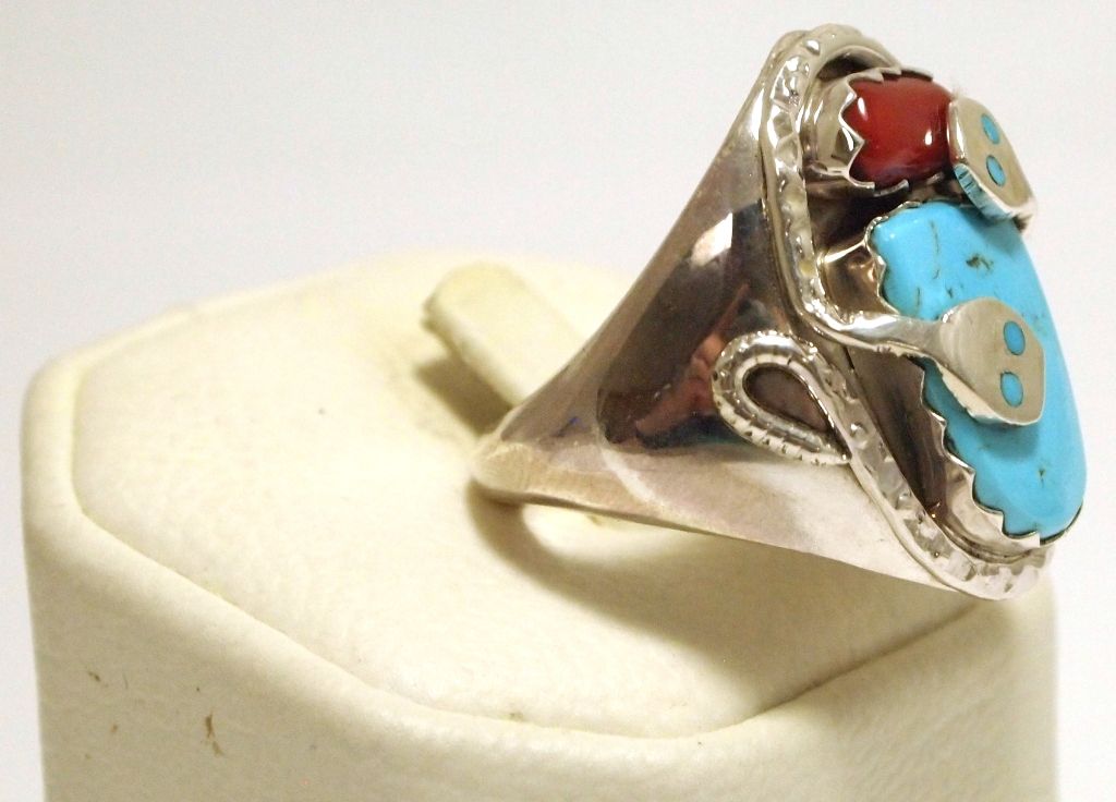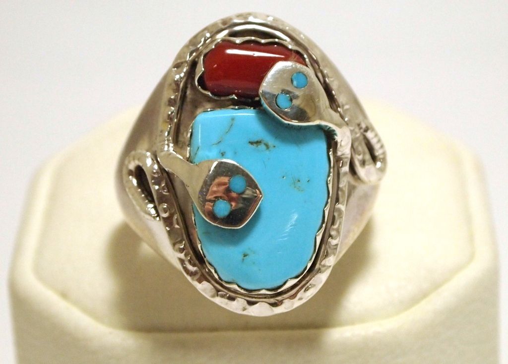 Zuni Coral & Turquoise Sterling Silver Snake Men's Ring - Effie Calavaza