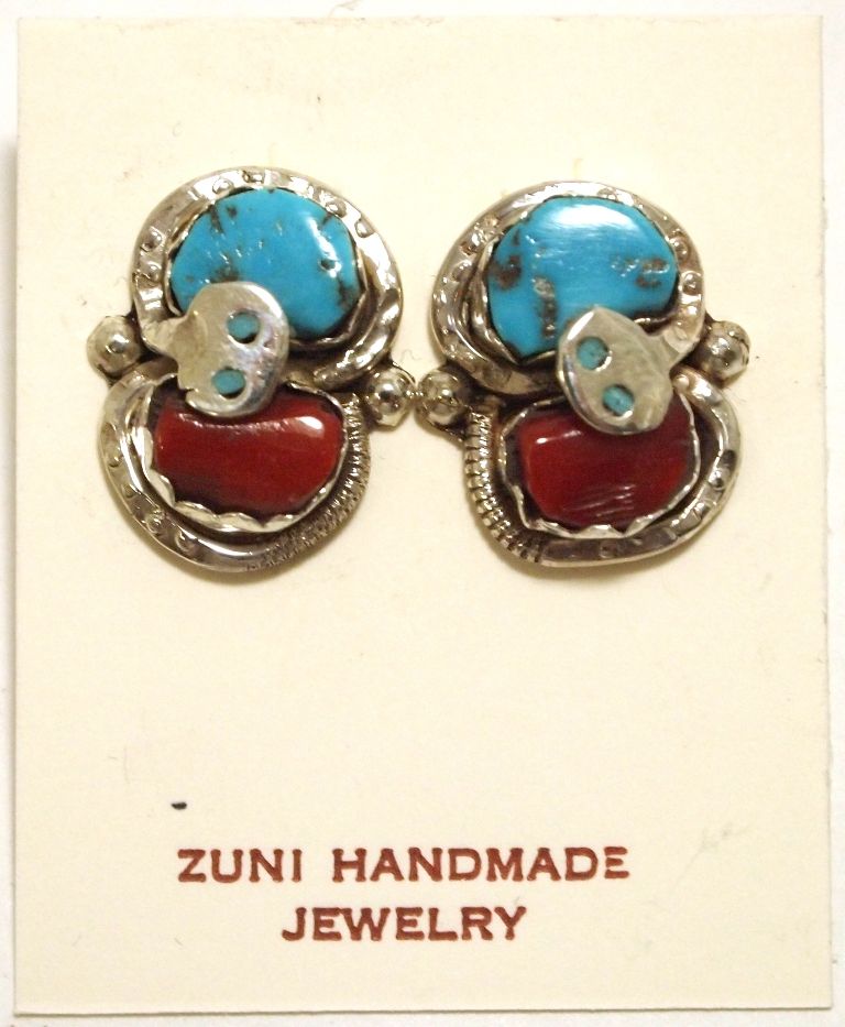 Zuni Coral & Turquoise Sterling Silver Snake Post Earrings - Effie Calavaza
