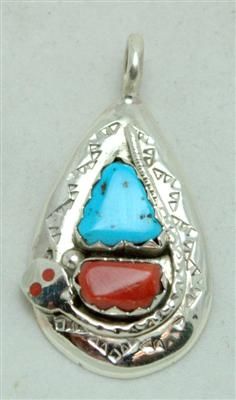 Zuni Coral and Turquoise Medium Teardrop Snake Pendant - Effie Calavaza