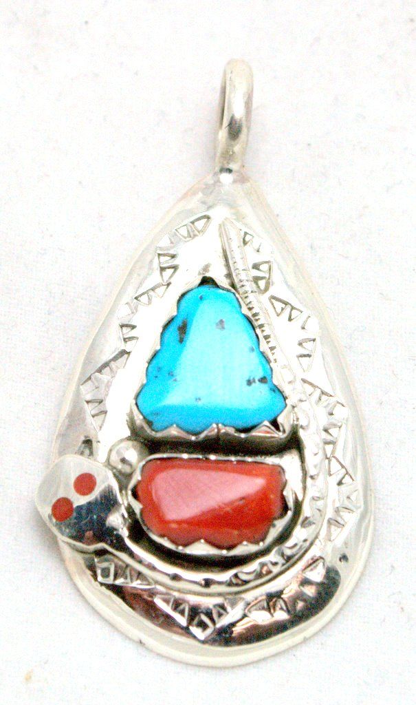 Zuni Coral and Turquoise Medium Teardrop Snake Pendant - Effie Calavaza