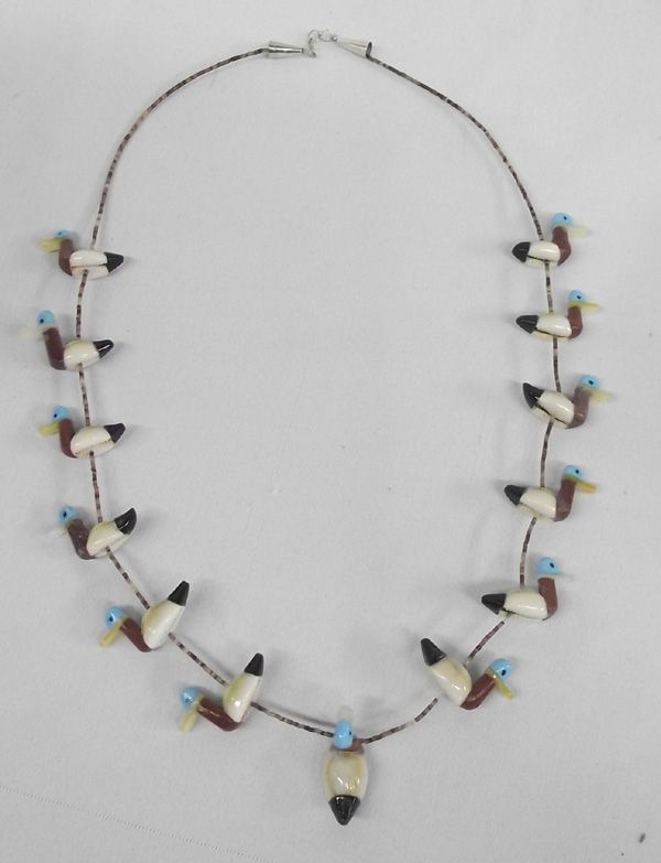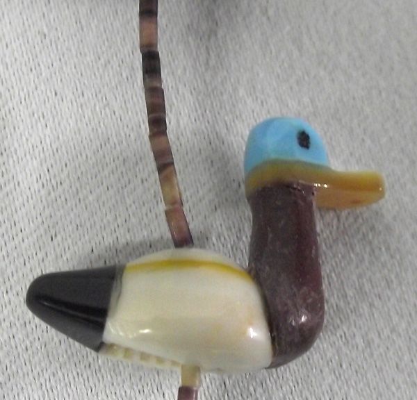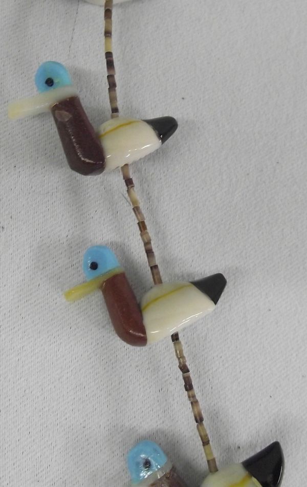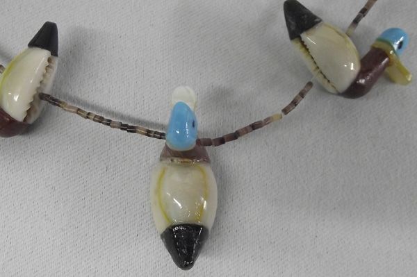 Zuni Cowrie Shell Duck Necklace. Amazing talent on the duck figures on this necklace. They are cowrie shell body with stone to stone inlay - pipestone neck, mother of pearl beak, turquoise head with jet eyes and a jet tail. The strand is very fine tortiseshell heishi. It measures 26'' end to end. The ducks are 3/4''H x 1-1/8''L.