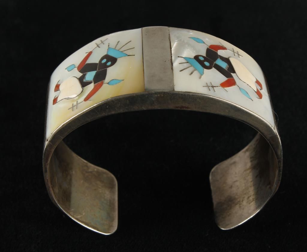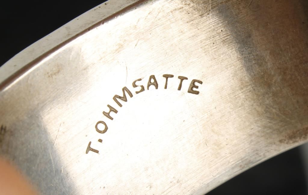 Set in sterling silver signed T. Ohmsatte. Inlaid with mother of pearl, turquoise, spiny oyster, and onyx.