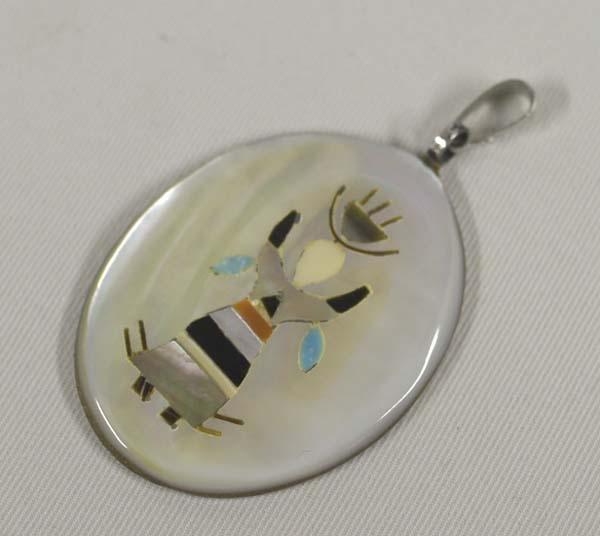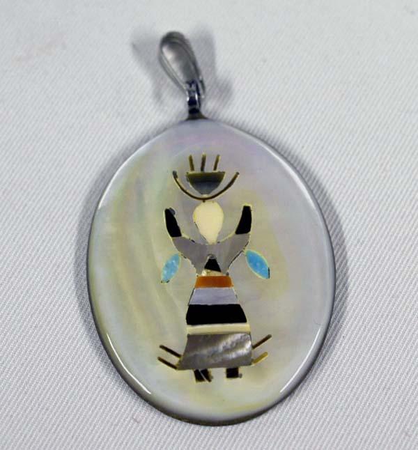 Zuni Dancer Inlay Pendant, Mother Of Pearl, Turquoise, Jet, Coral, measures approx. 2'' x 1 1/2''. SHI $15.