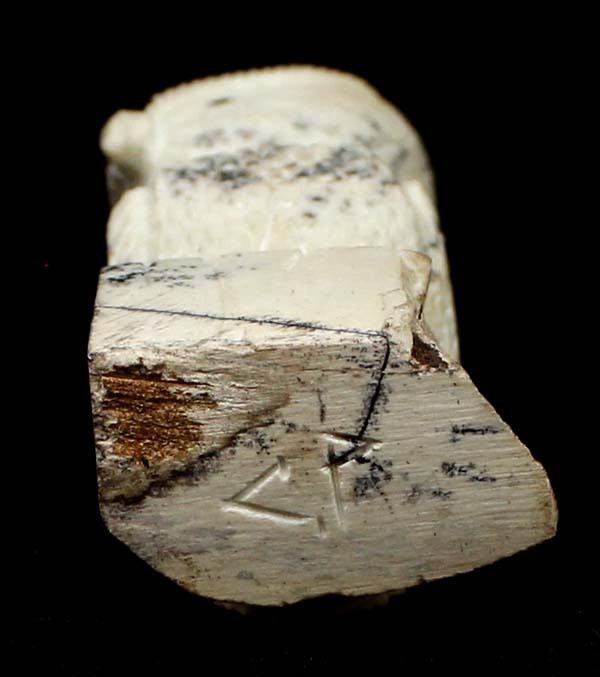 Native American Zuni Dendritic Fishrock Owl Fetish by Chris Peina, measures 1'' x 1.5'' x 3.25'' and has artist's intials on the bottom, jet eyes