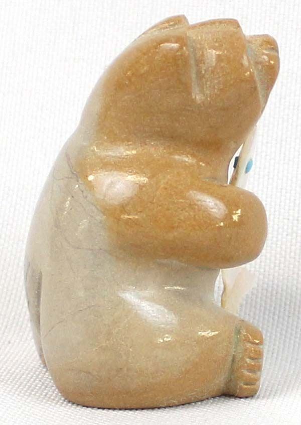 Native American Zuni Dolomite Bear Fetish by Carl Etsate, measures 1.75'' x 1.25'' x 1.75'' and has artist's initials on the bottom, turquoise eyes
