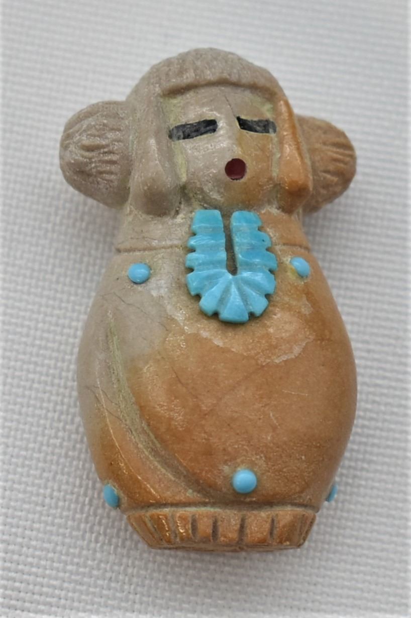 Native American Zuni Dolomite Corn Maiden Fetish by Gayla Eriacho, turquoise necklace, embellished with turquoise microdots, signed on the bottom, measures 1.5''H x 7/8''W x .5''Deep