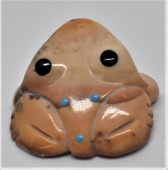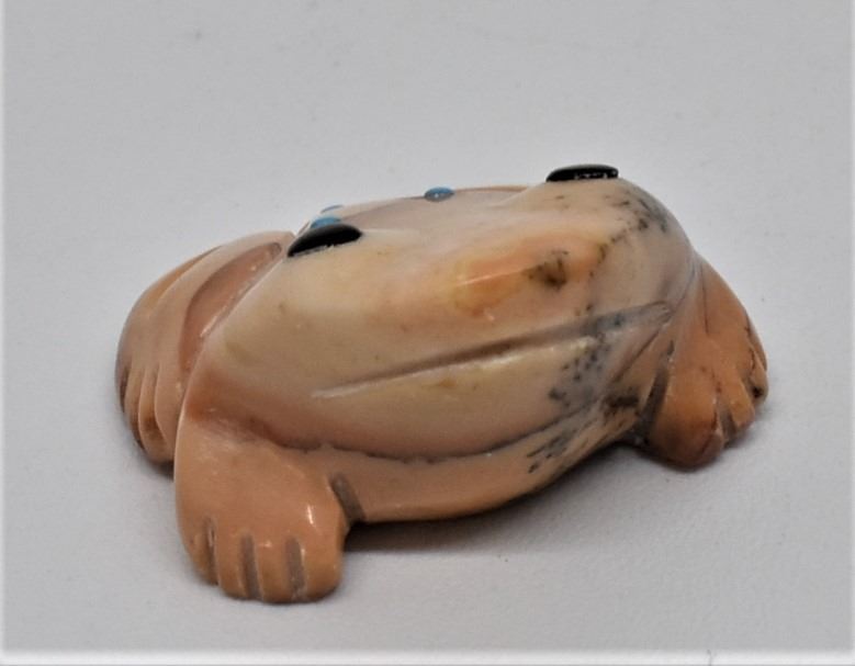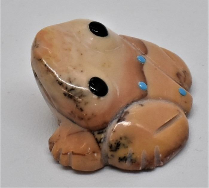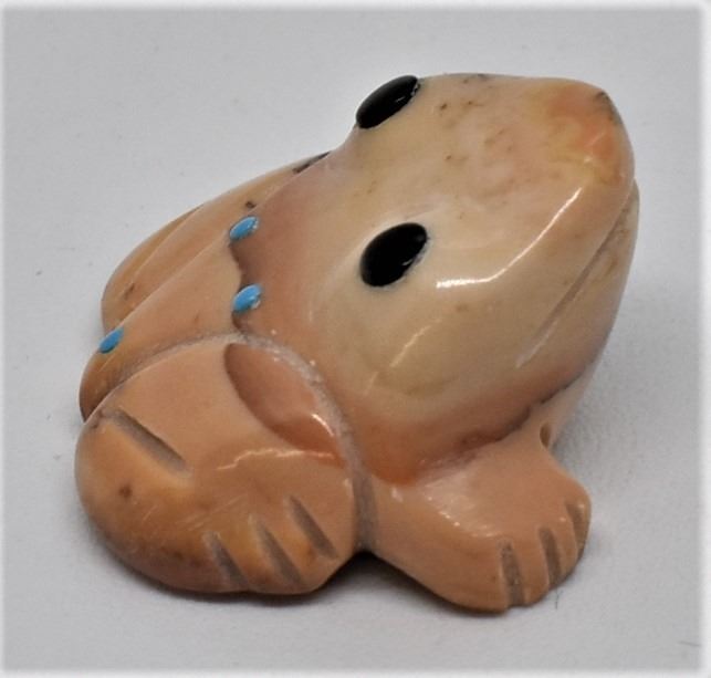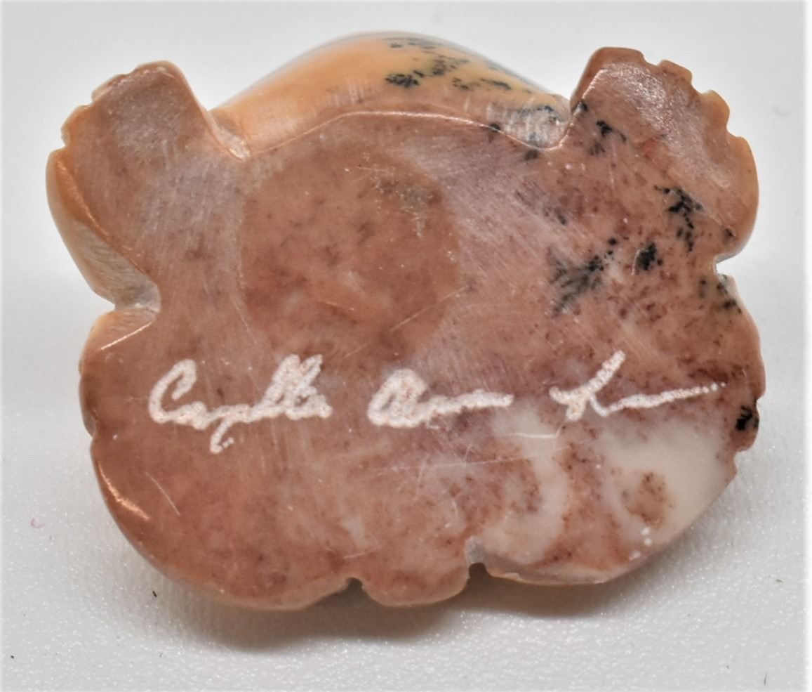 Native American Zuni Dolomite Frog Fetish by Georgette Quam, measures 1'' x 1'' and is signed on the bottom