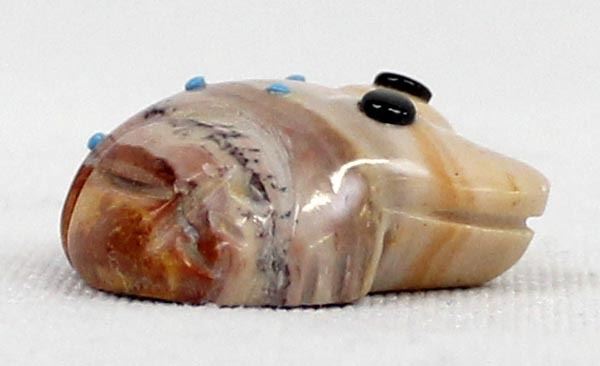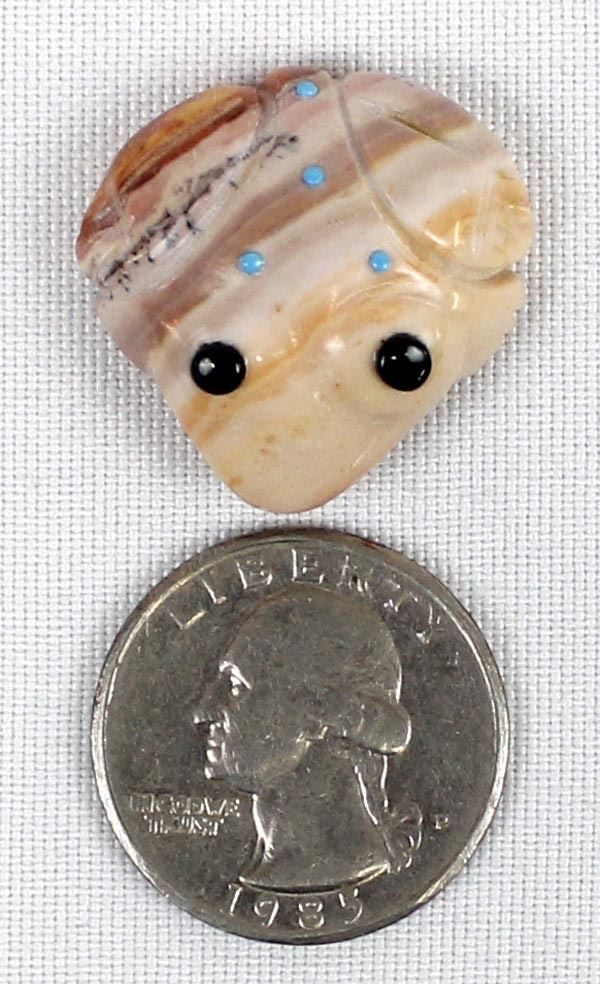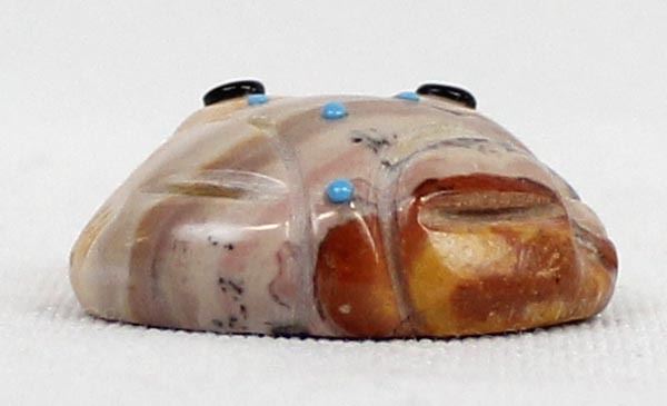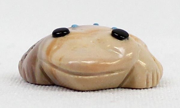 Native American Zuni Dolomite Frog Fetish by Reynold Lunasee and Georgette Quam, measures .25" x 1" x 1" and is signed on the bottom, jet eyes and turquoise spots