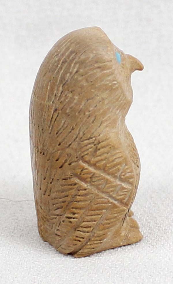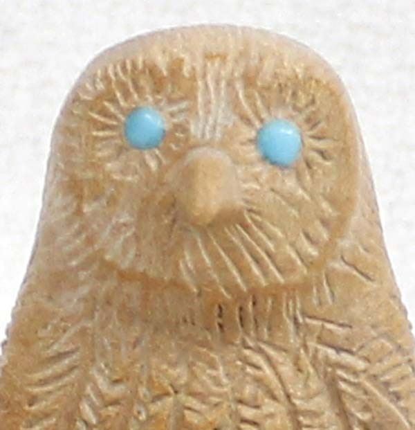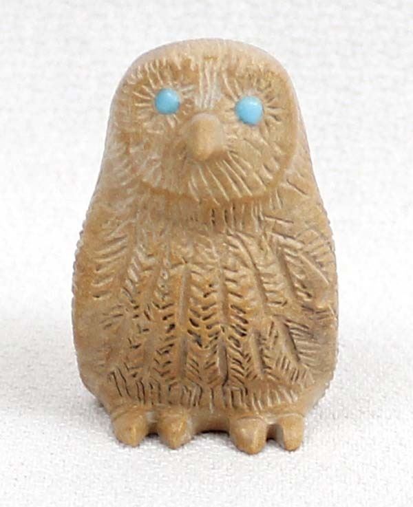 Native American Zuni Dolomite Owl Fetish by Bernie Laselute, measures .5'' x 1.25'' x 1'' and has artist's initials on the bottom, turquoise eyes, nice detail on the feathers
