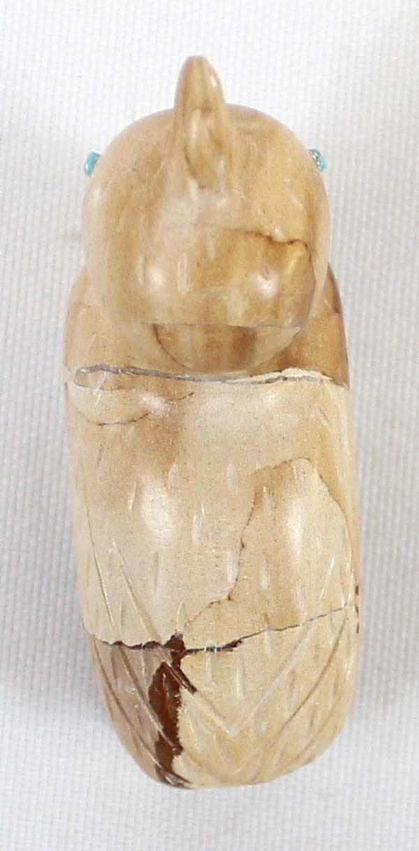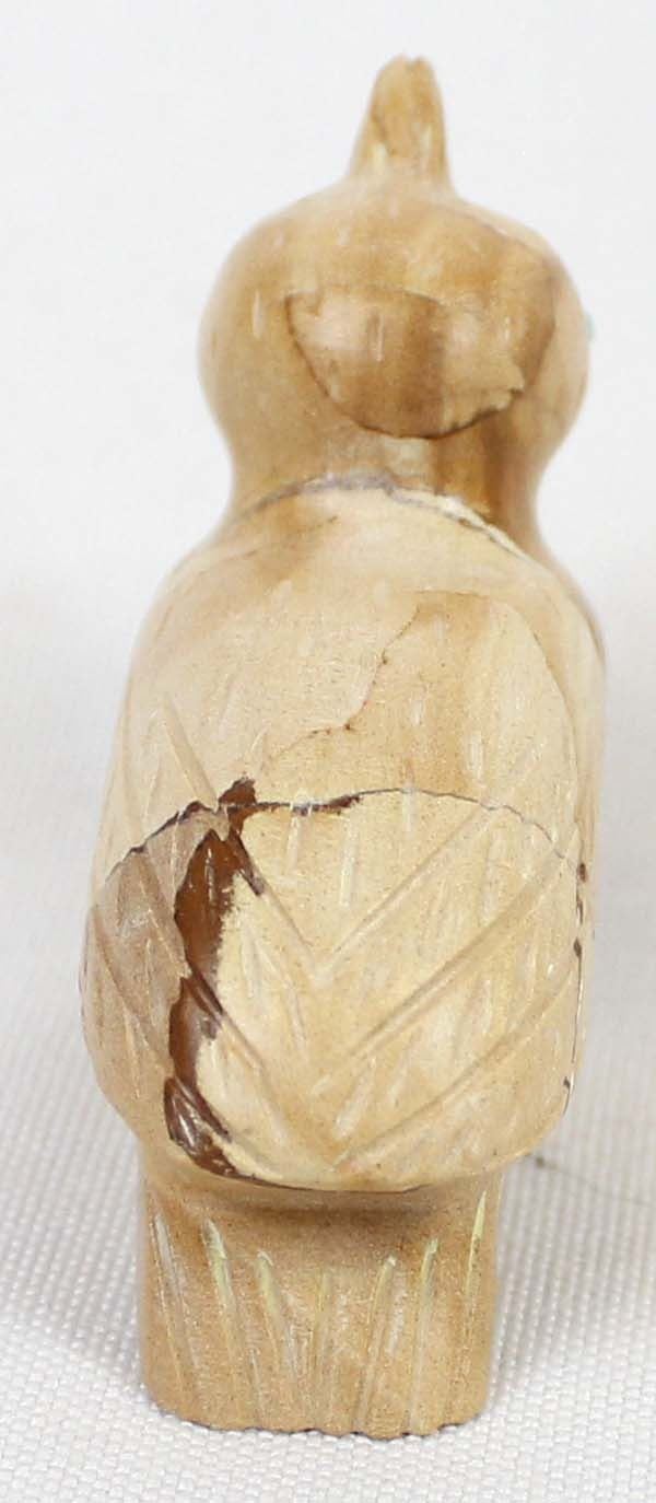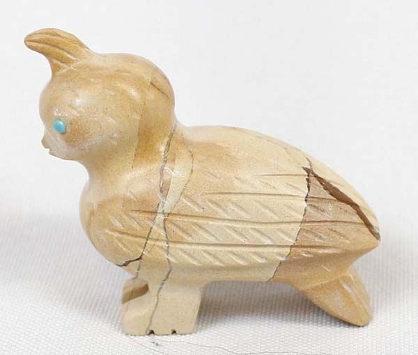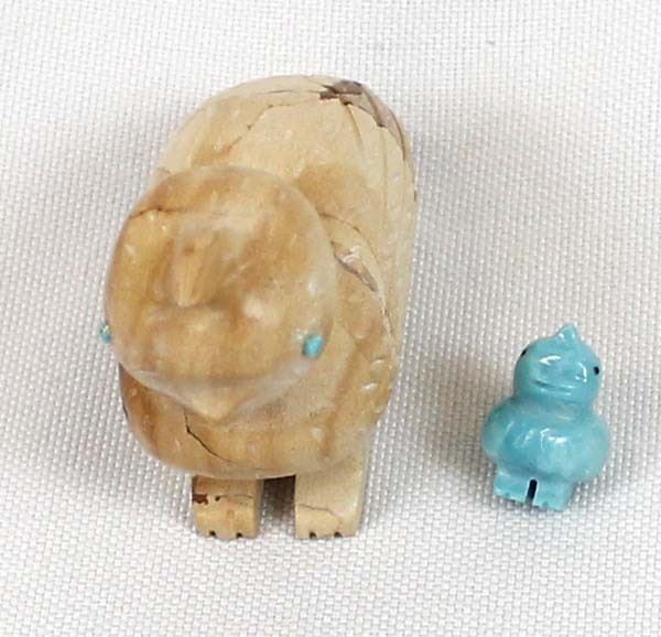 Native American Zuni Dolomite Quail Fetish and Baby by Verla Lasiloo Jim (d.), measures 2'' x 2'' and has artist's initials on the bottom of the mother, baby is carved turquoise and mother has turquoise eyes