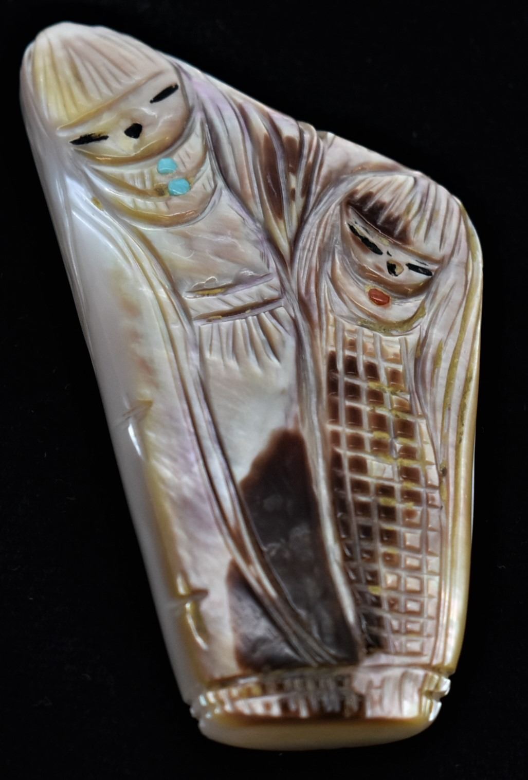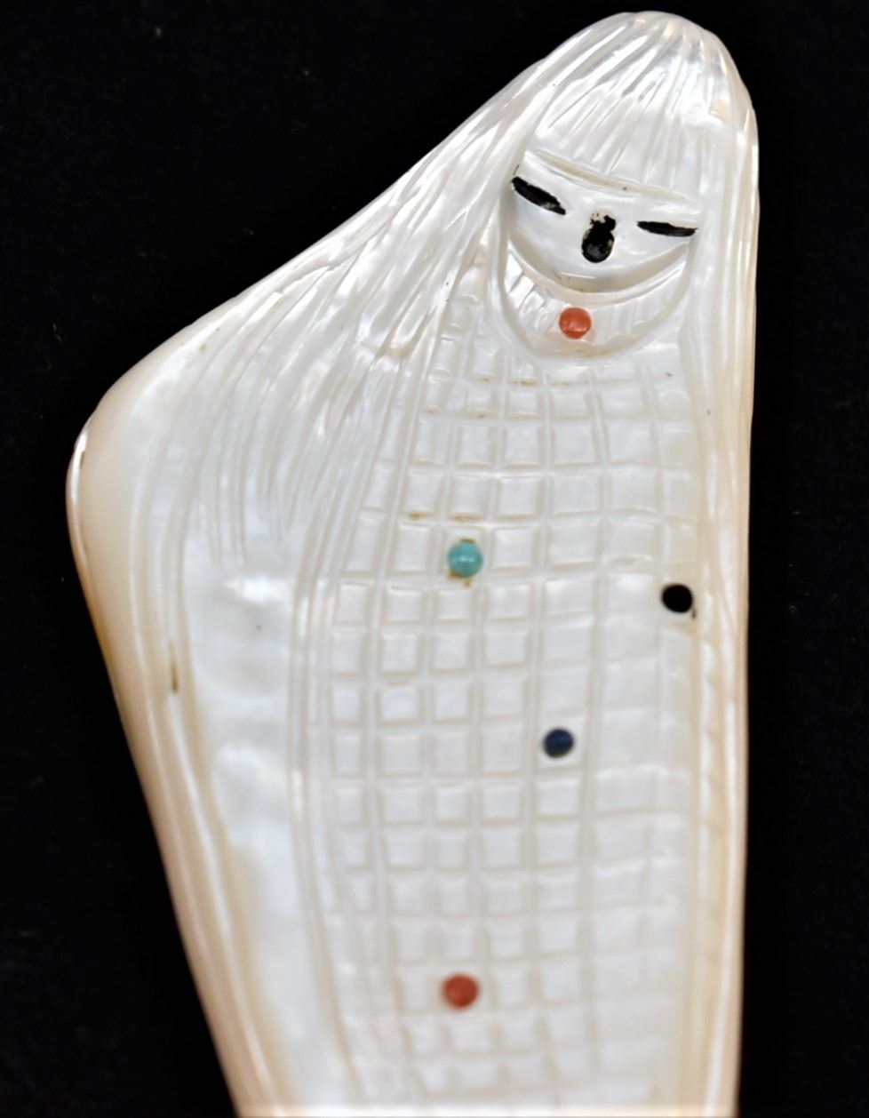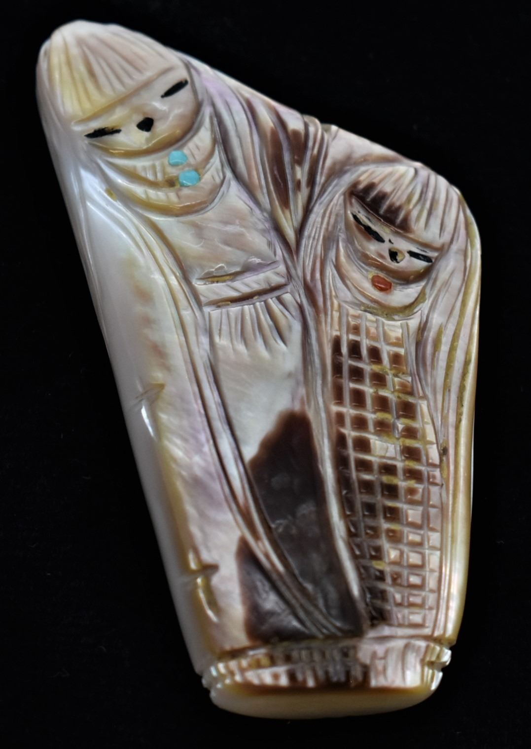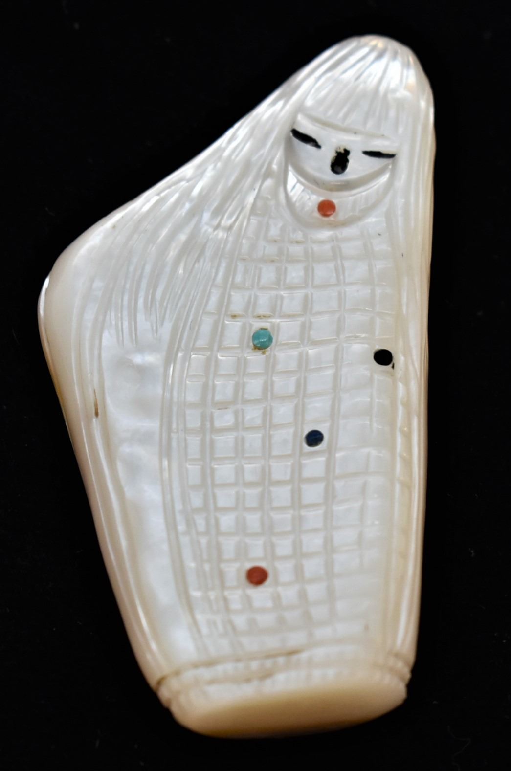 Native American Zuni Double Sided Mother of Pearl Corn Maiden Fetish by renowned carver Sandra Quandelacy, embellished with inlay microdots of turquoise, coral, and jet, on one side is a single maiden while the other side features 2 maidens, measures 1" x 2.25"