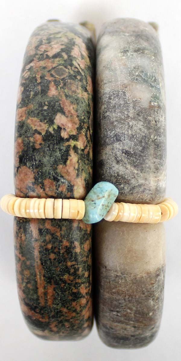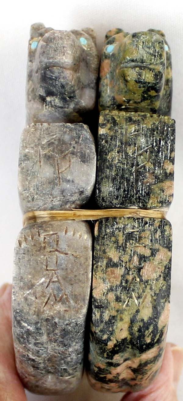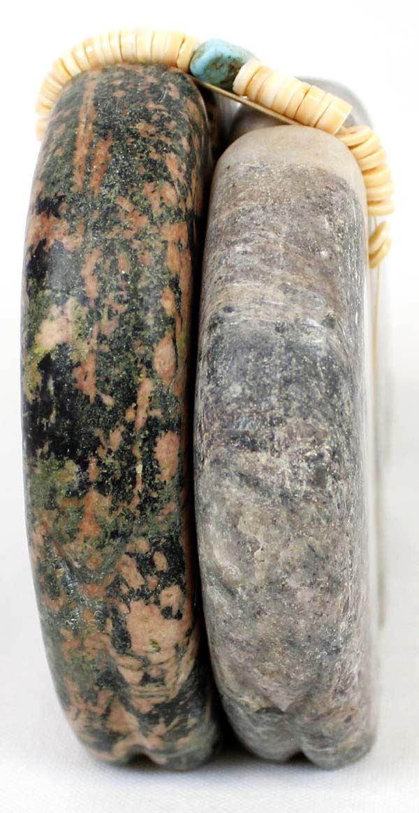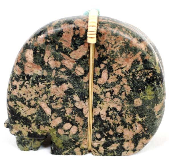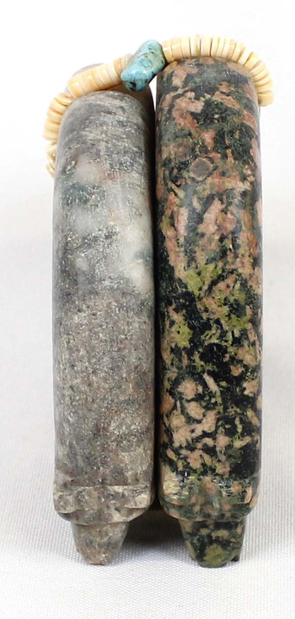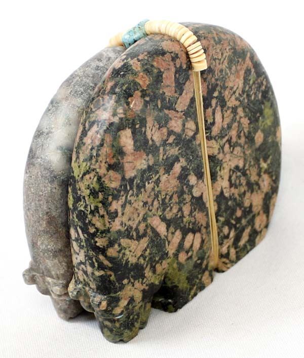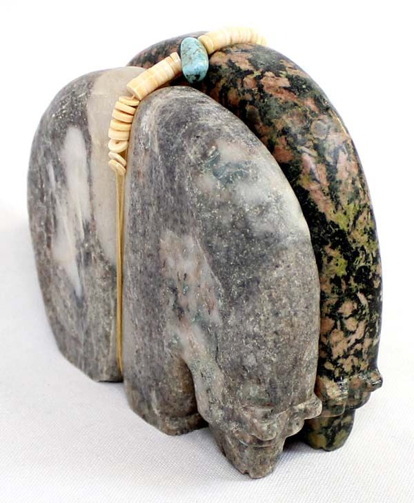 Native American Zuni Double Unity Medicine Bear Fetish by Farlan & Paulette Quam, measures 4''L x 3 5/8''H x 2''W and is signed on the bottom, orange shell heishi & turquoise nugget spirit bundle, possible stones Yooperlite and Gray Marble