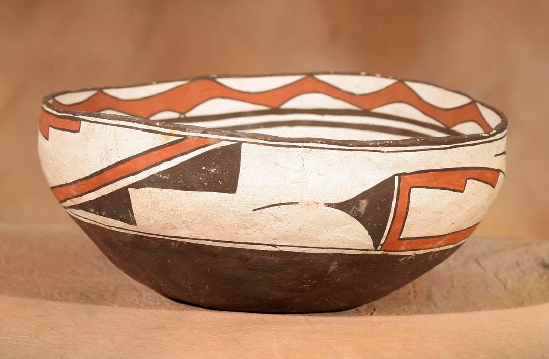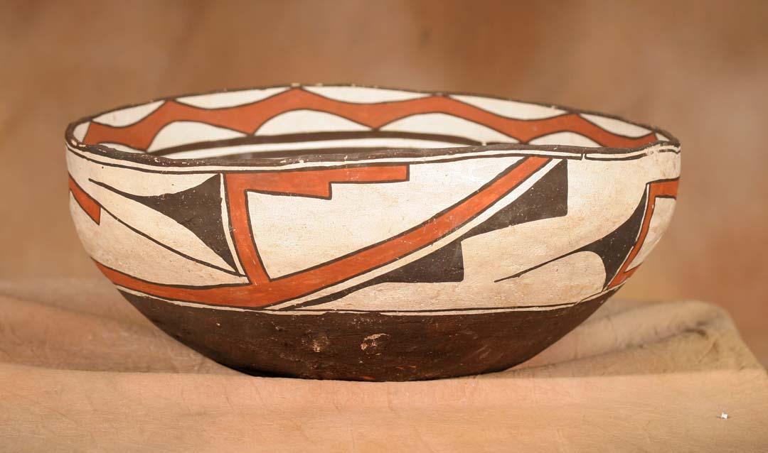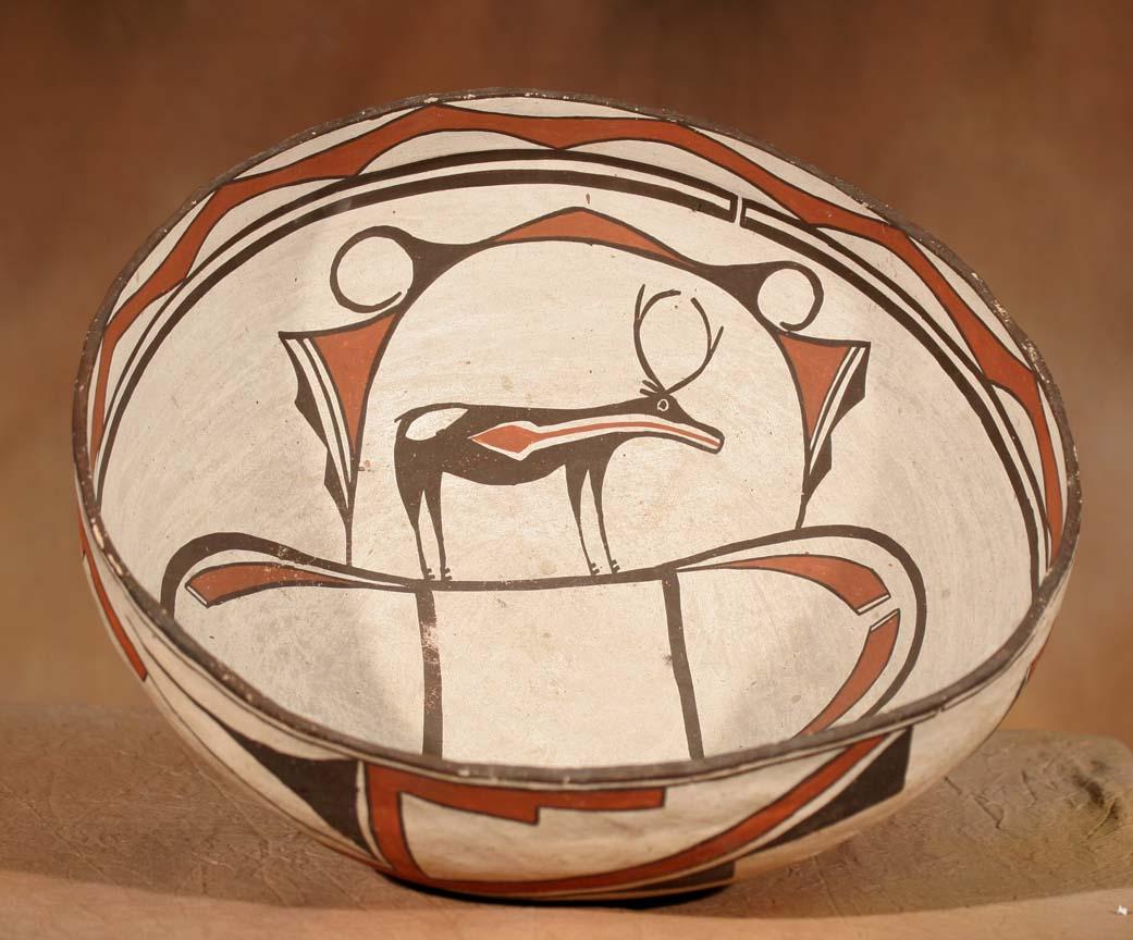 Zuni Dough Bowl. 6" x 15". Heart-line Deer designs. Circa 1890-1900. (est $5,000-7,000). Provenance: Bethany College, Lindsborg, KS. For condition reports please visit: www.auctioninsantafe.com/cr2011.pdf