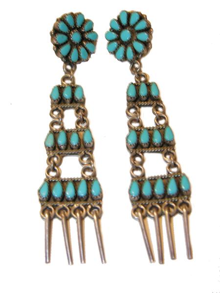 Circa 1960, Zuni pierced tear drop earrings with turquoise cluster work done in ladder style. 4"