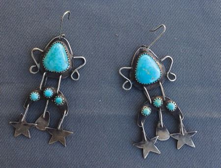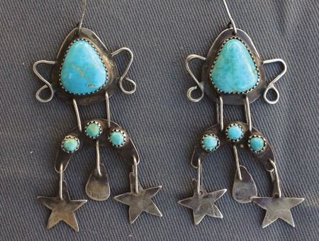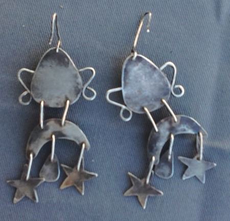 Ca. 1950s, Hand wrought silver and turquoise earrings with crescent, stars, and paddle dangles. Very good condition.. 2" x 1"