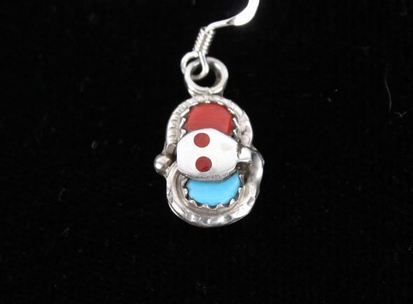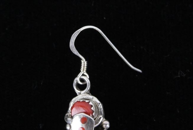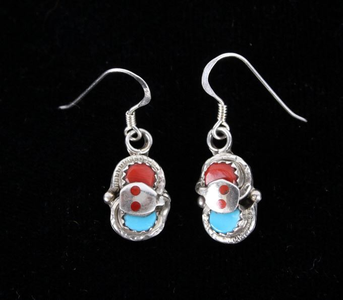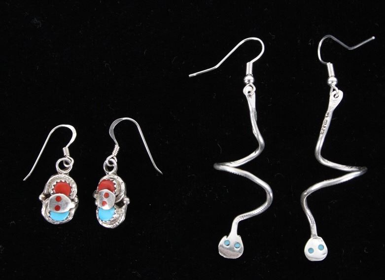 Featured in this lot is this sterling silver inlaid snake earrings from Zuni artist Effie C. There are two earrings in this collection. The first is a wonderfully and professionally crafted sterling silver construction that shows a spiraled snake design that shows inlaid turquoise eyes; the earrings are marked 'Effie C.' on the tail of the snake. The second pair of earrings pair of earrings shows a wonderfully and professionally crafted sterling silver construction that shows a coiled snake that shows inlaid red branch coral eyes and is coiled around round red branch coral and turquoise cabochon set into the face of the earrings; the earrings are marked on the back side of the earrings 'Effie C.' and 'Zuni' underneath the hallmark. The condition of this collection of earrings is good with no obvious signs of damage and shows good overall condition. The measurements of these earrings is 2 1/2" x 5/8" x 7/8" and for the second pair of earrings measure 1 1/4" x 3/8" x 3/4". The collective weight of these earring is 8.7g.
