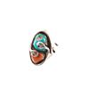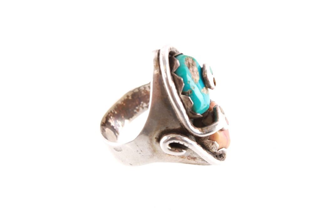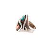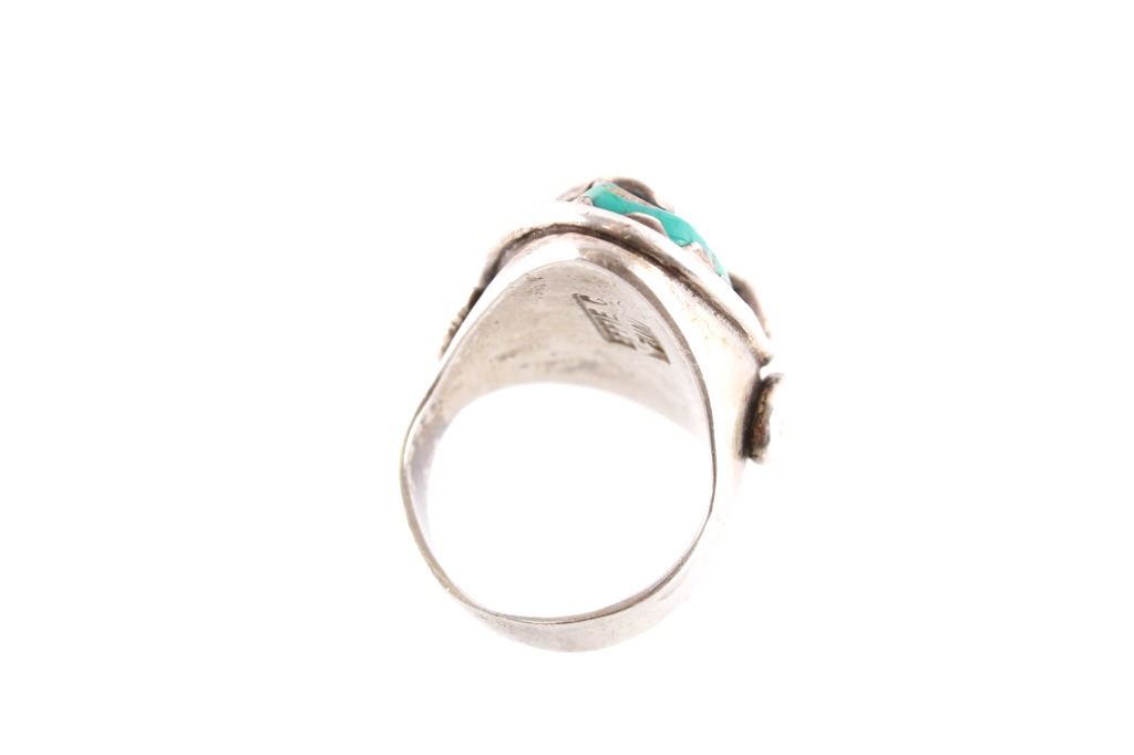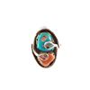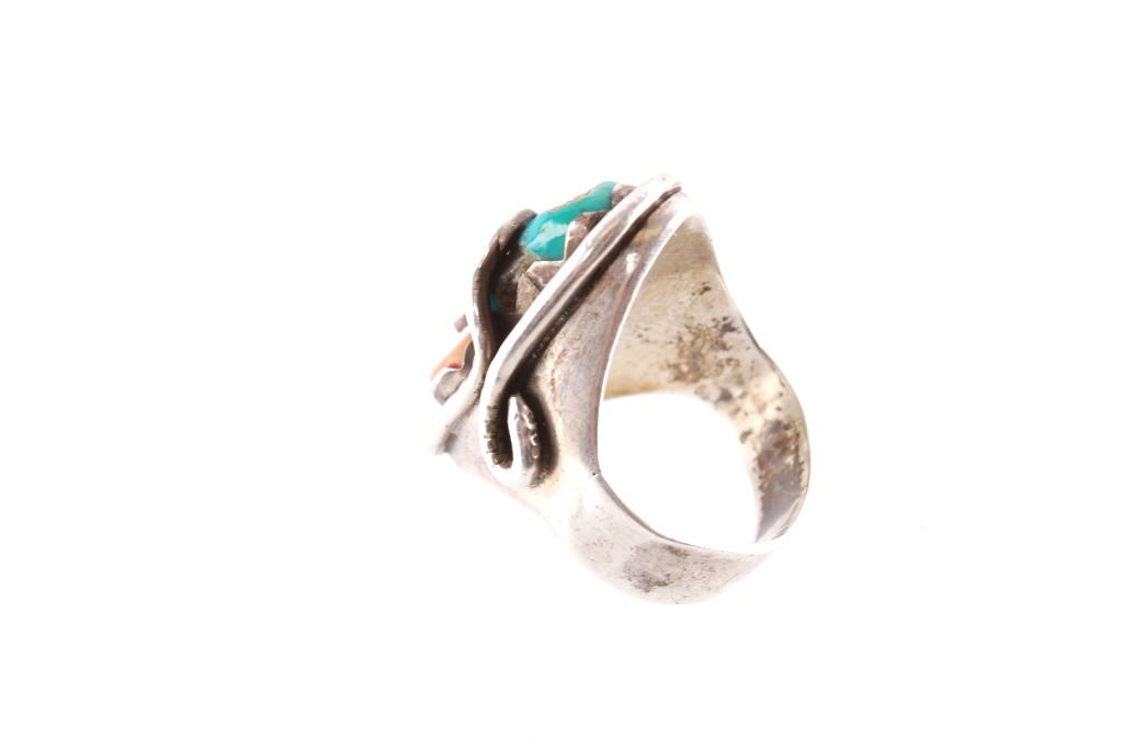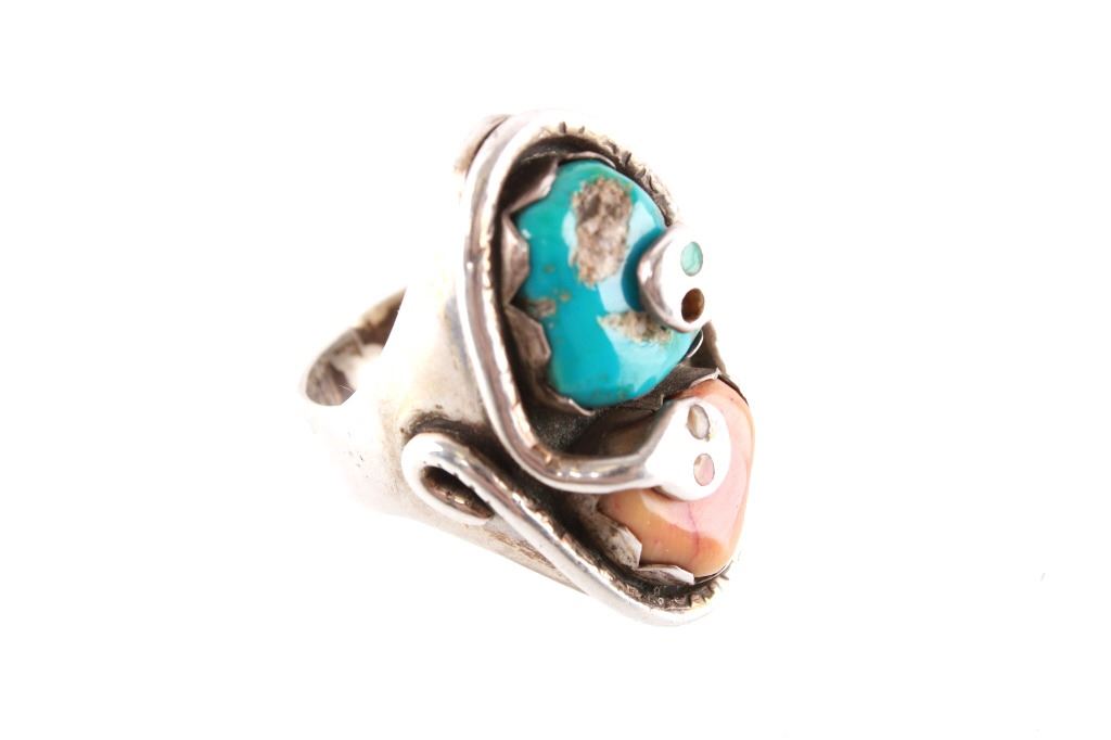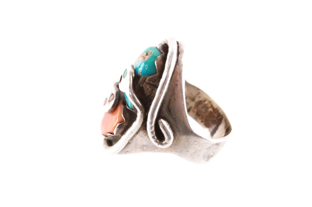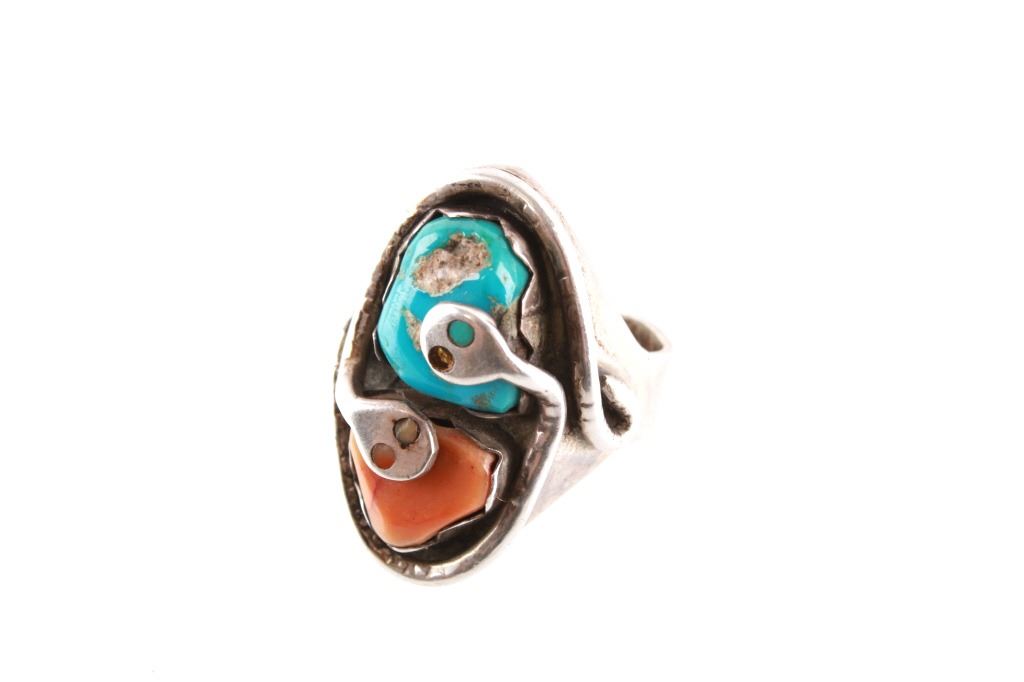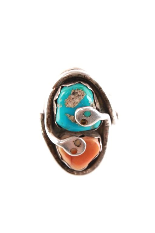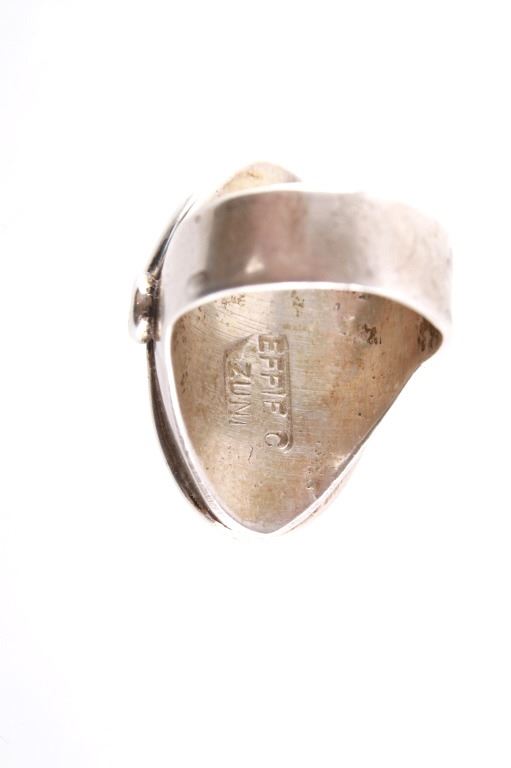 For your consideration in this lot is a silver, turquoise and coral "Snake" ring by world famous Native American Zuni silver artist Effie Calavaza. This heavy men size ring shows two snakes shadow boxing a cabochon of turquoise and one of coral. Effie Calavaza is a Zuni Silversmith whose work has captured the hearts of many collectors. She was born in 1928 and started making jewelry in her early years. Effie also went all the way to the Supreme Court of the United States of America to obtain full copyright of her art work to stop those from importing fake pieces of her work. Now in her 90's, Effie mostly supervises her daughters silverwork she has passed her designs down to her daughters. Her work is collected throughout the world. The ring is marked with her hallmark Effie C. Zuni on the inside. The ring is U.S. size 10 1/4, and weighs 27.4 grams