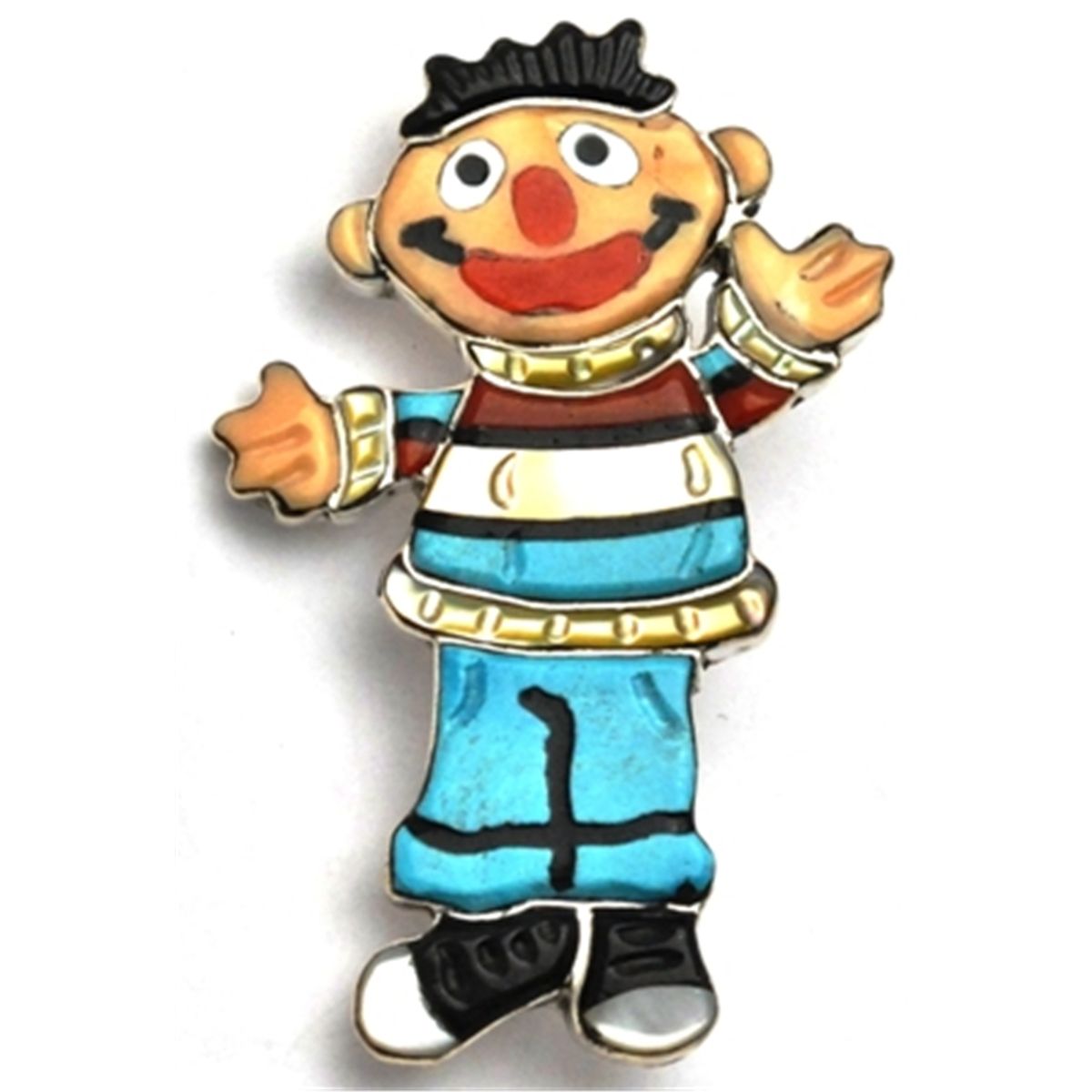 Measures 2" tall by 1-1/4" wide. Pin on back measures 1-1/4". Stones: White Mother of Pearl, Golden Lipped Mother of Pearl, Melon Shell, Black Jet, Coral, Turquoise.