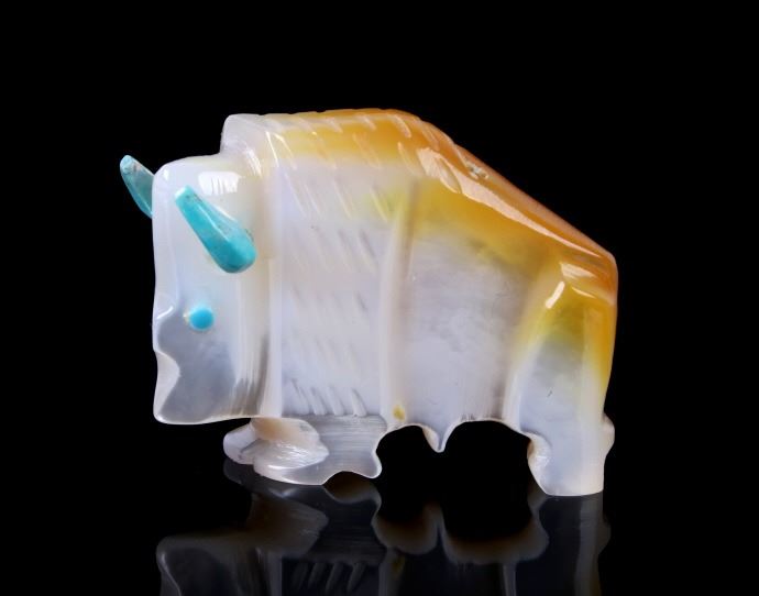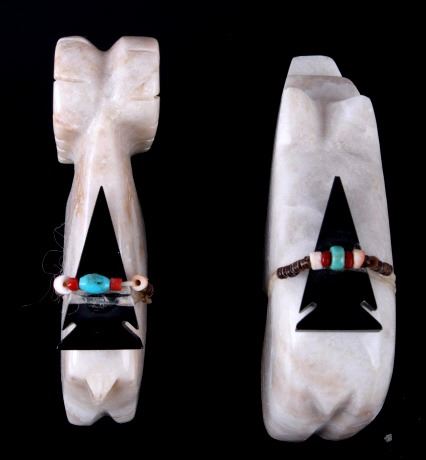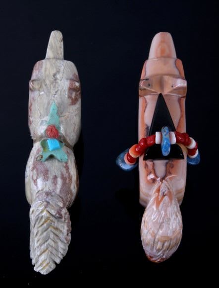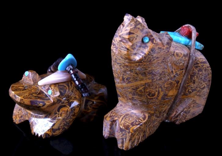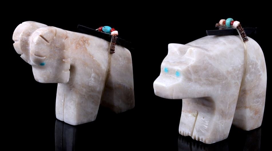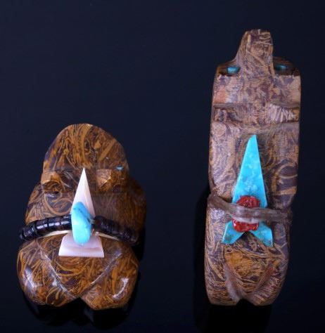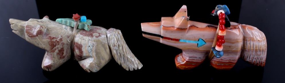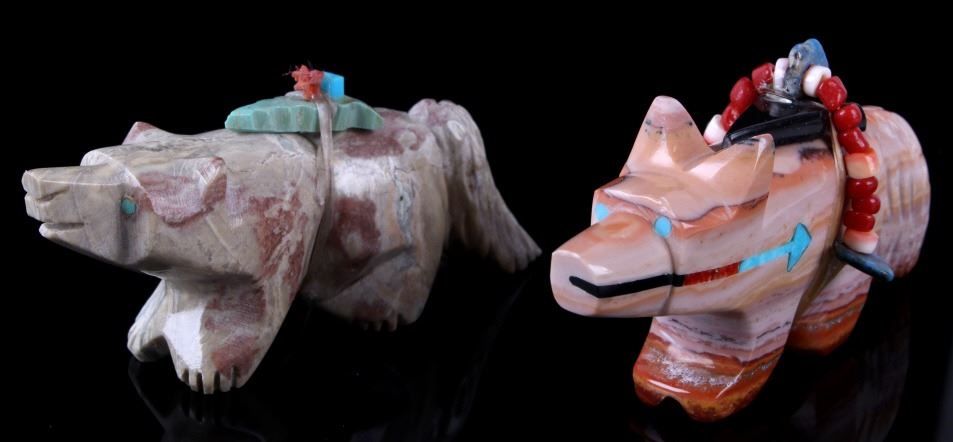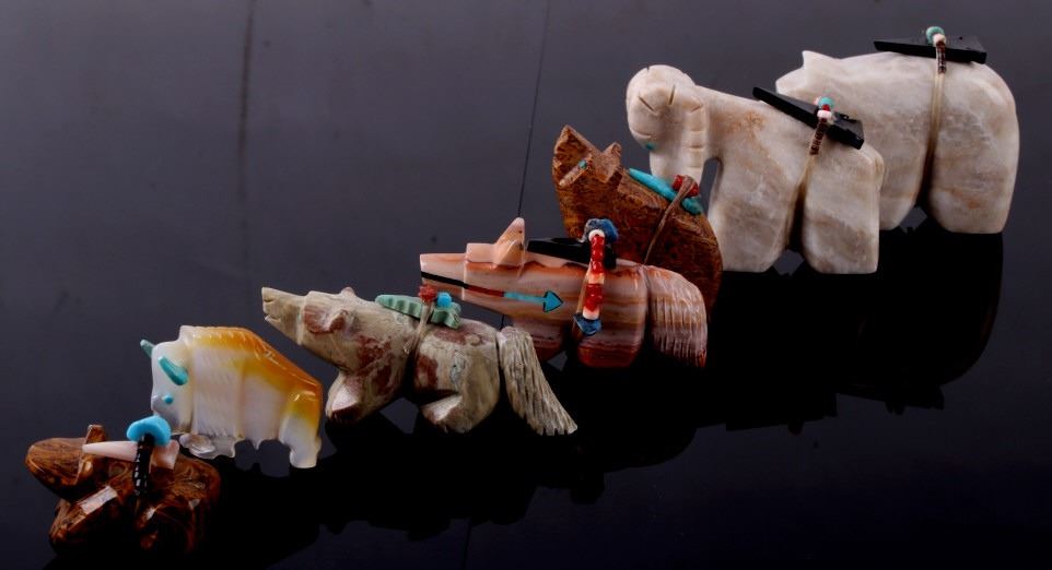 For your consideration is this 7 piece Zuni fetish collection. The collection includes 2 bears, 2 wolves, a frog, a buffalo, and a ram. all crafted by Zuni artists using a variety of materials. The largest measures about 3" l x 2" t; the smallest about 1 1/4" l x 1 1/8" t. All are in very good condition.