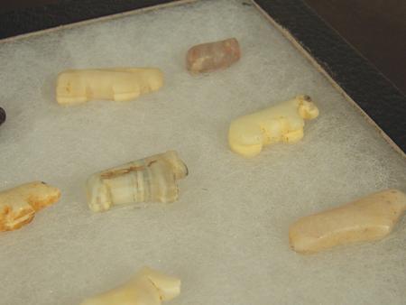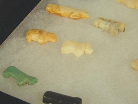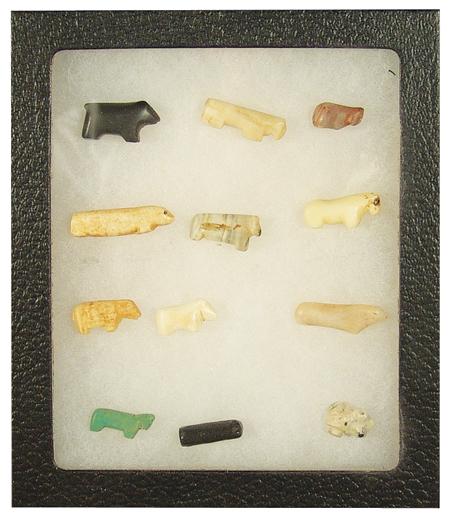 Set of 12 hand carved bear and other figures, a few old ones, done in turquoise, jet, bone, and other stones. Condition: all very good. 3/4" to 1-1/2"