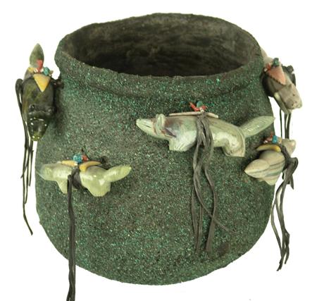 Circa 1970s, Marvelous turquoise chip exterior fetish pot with eight finely carved fetishes with bundles on exterior and three on interior. Has feeding tube. Edna is the granddaughter of Leekya. 9" x 9"