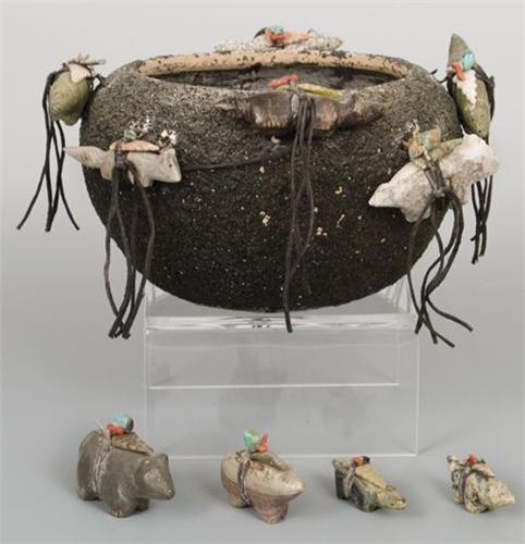 Zuni Fetish Pottery Bowl. 5" x 9". 1940s. 12 wonderful carved stone fetishes. Excellent condition. (est $1,200-1,500).