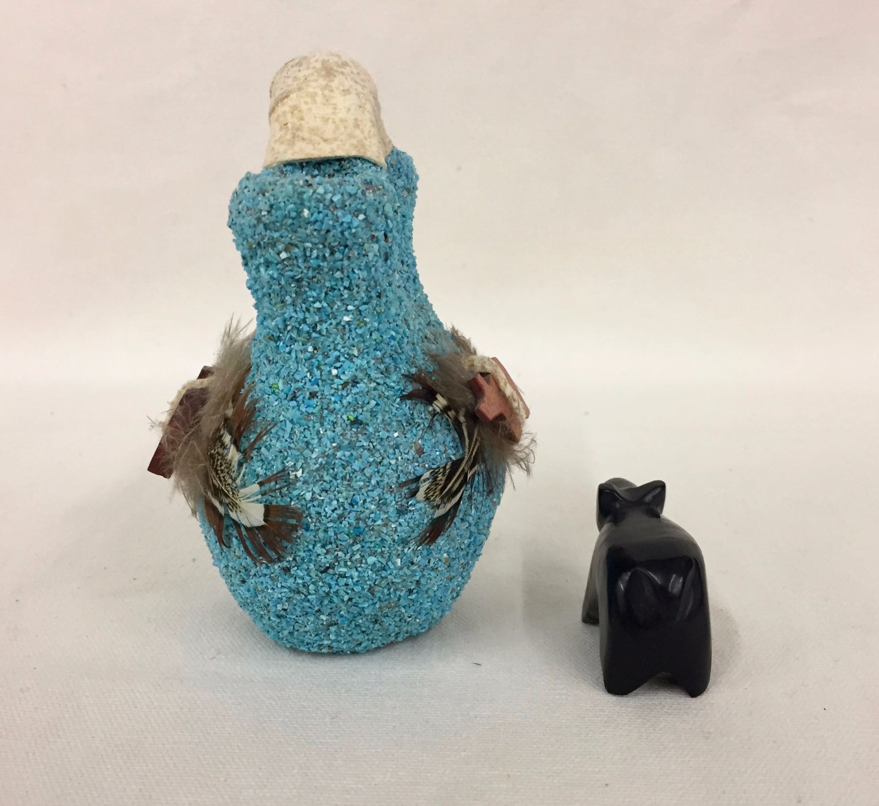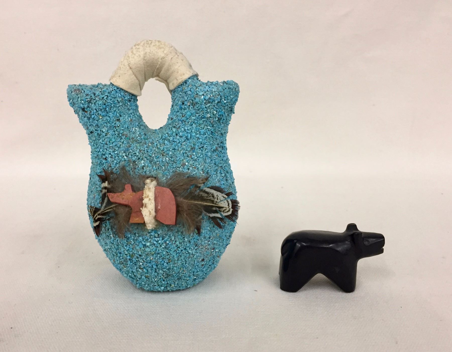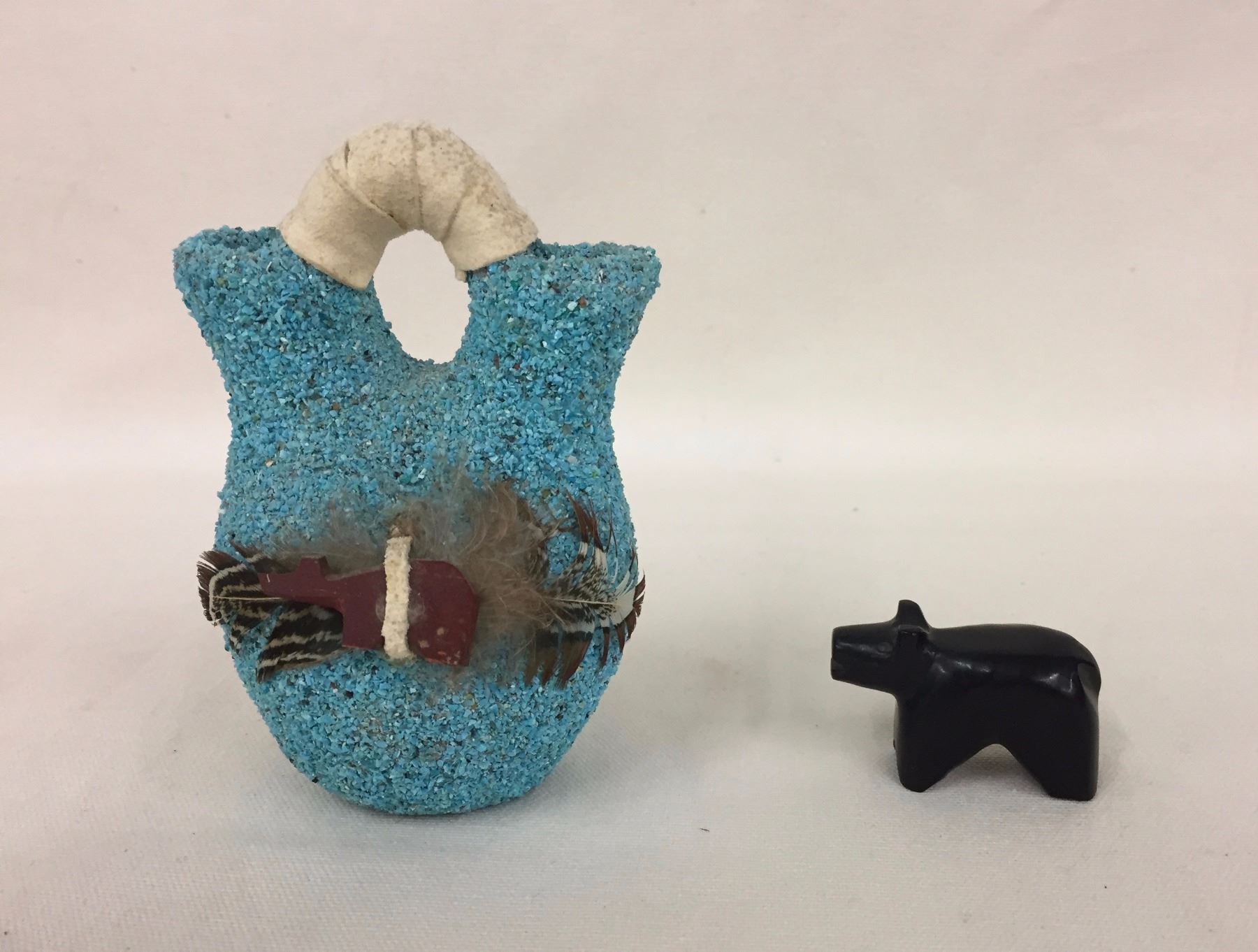 Description: A Zuni bear fetish and ornate turquoise encrusted fetish, “Wedding” pot. Maker: Unknown. Approx. Age: Circa 1970s. Size: Pots range from 1 7/8" w x 1 1/8" h to 3 1/8" w 5/8" h. Condition: Good for their age, normal wear expected. Please look closely at the pictures - they are an important part of our description. Shipping: There will be a $7 handling / packaging fee for shipping this lot. The actual cost of postage will be added on top of that.