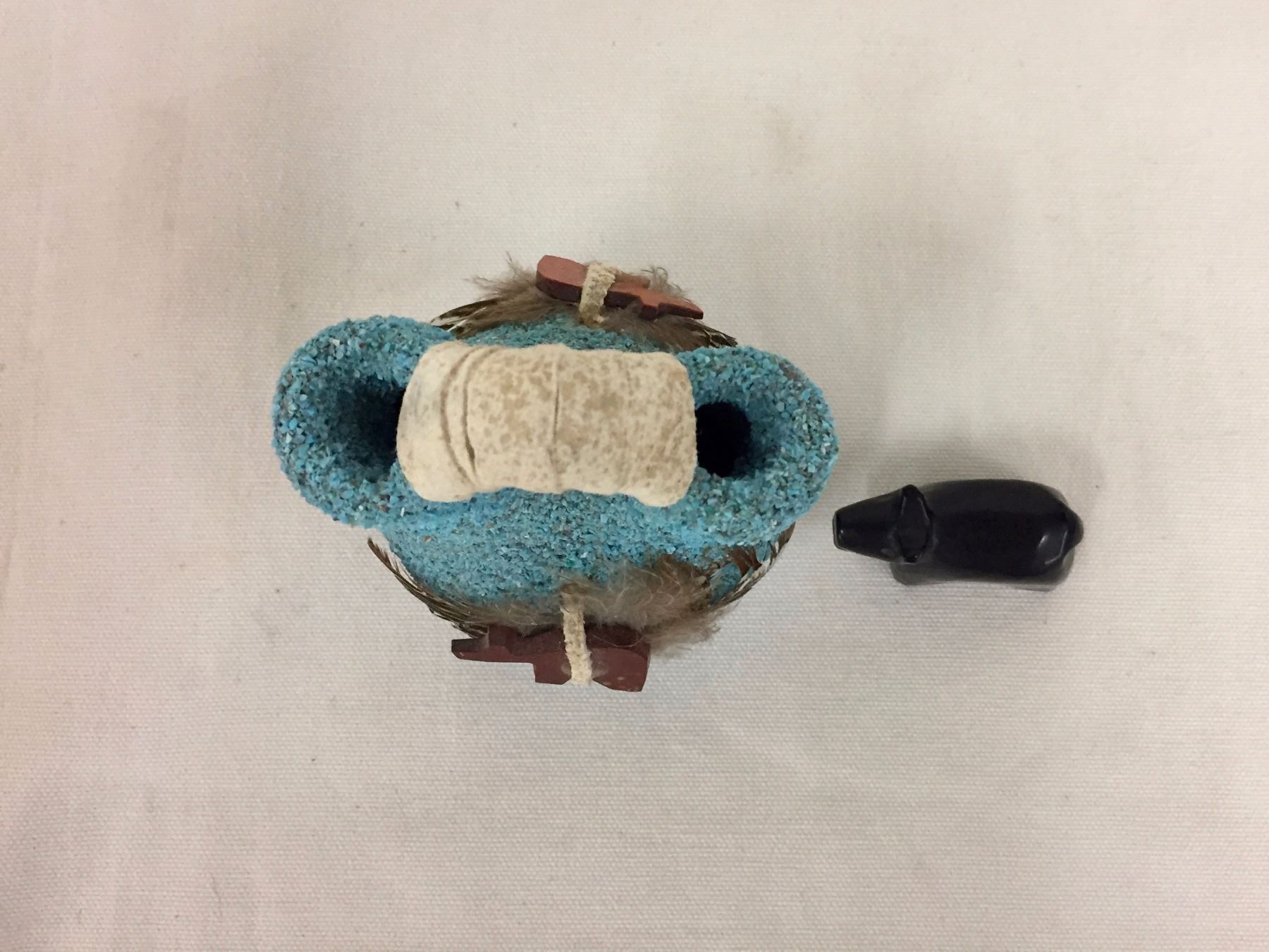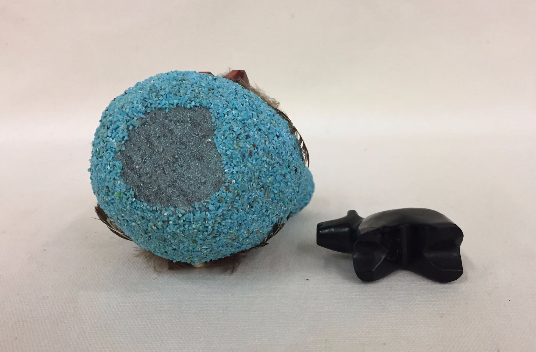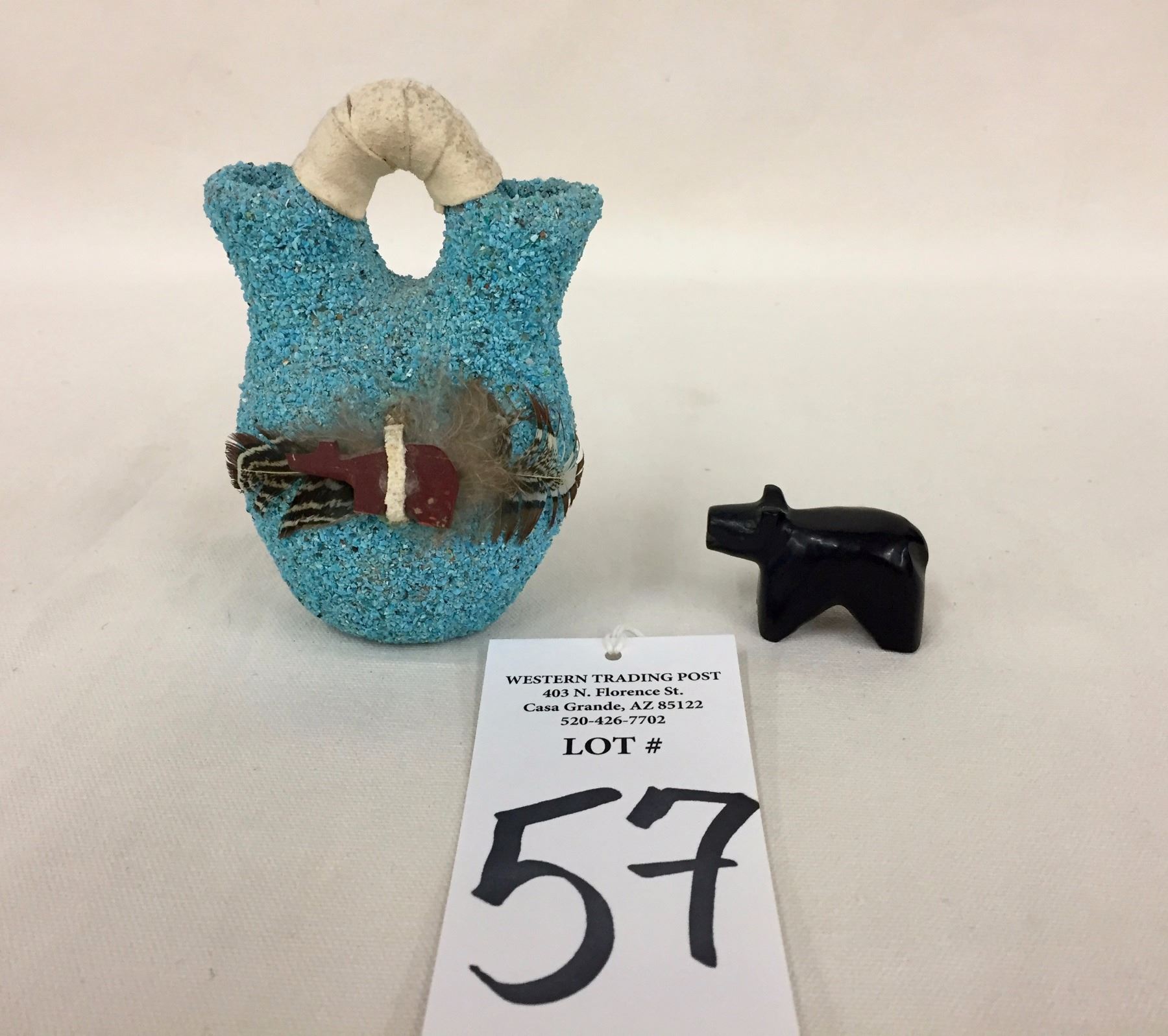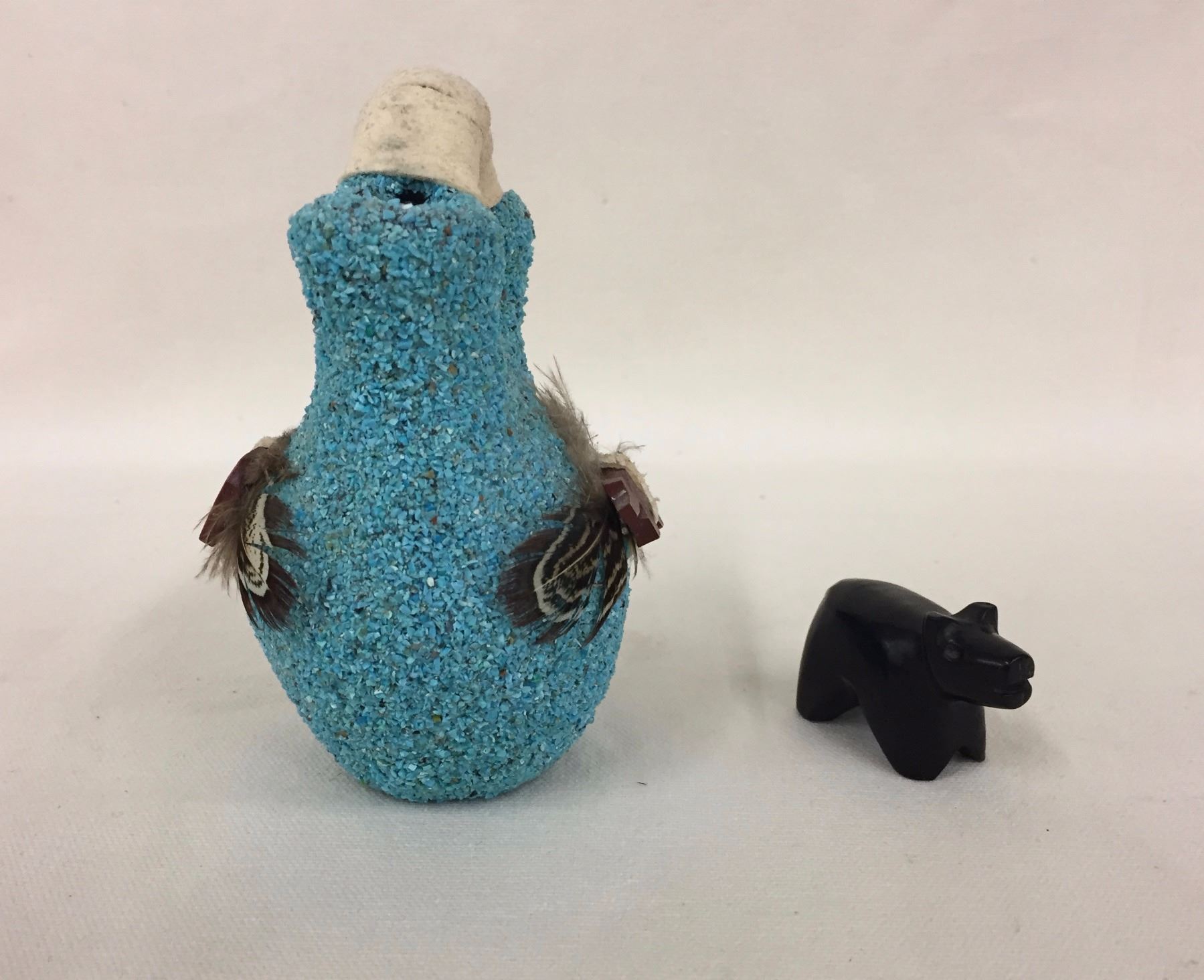 Description: A Zuni bear fetish and ornate turquoise encrusted fetish, “Wedding” pot. Maker: Unknown. Approx. Age: Circa 1970s. Size: Pots range from 1 7/8" w x 1 1/8" h to 3 1/8" w 5/8" h. Condition: Good for their age, normal wear expected. Please look closely at the pictures - they are an important part of our description. Shipping: There will be a $7 handling / packaging fee for shipping this lot. The actual cost of postage will be added on top of that.