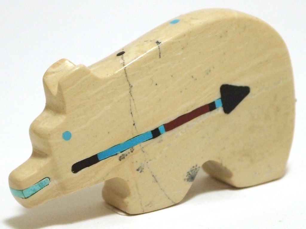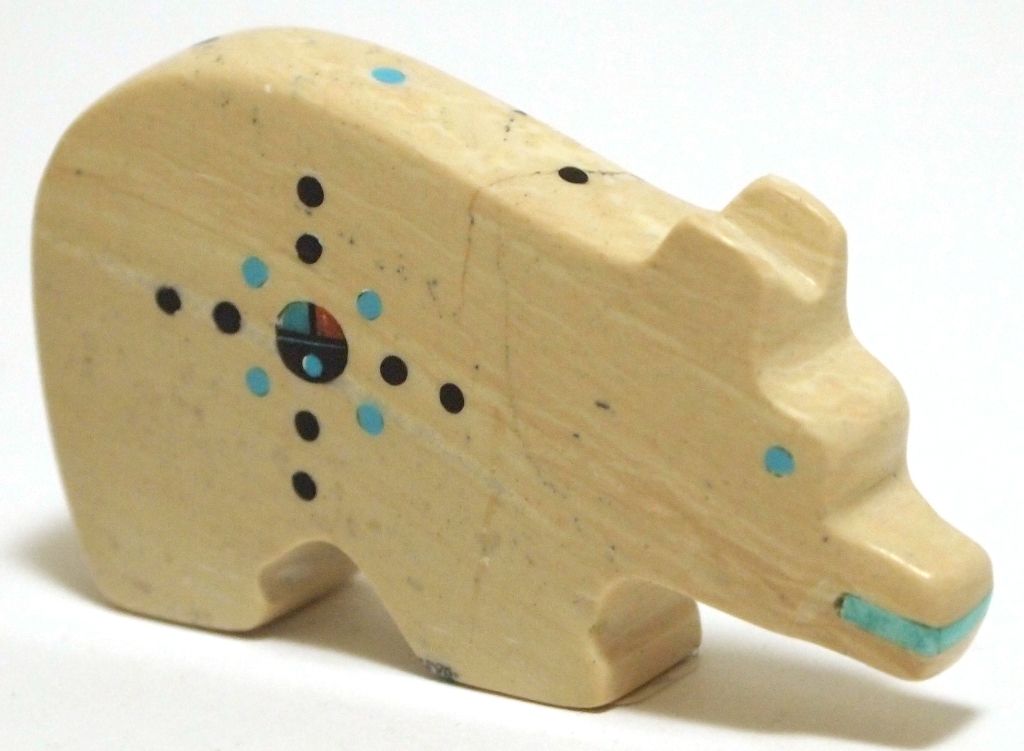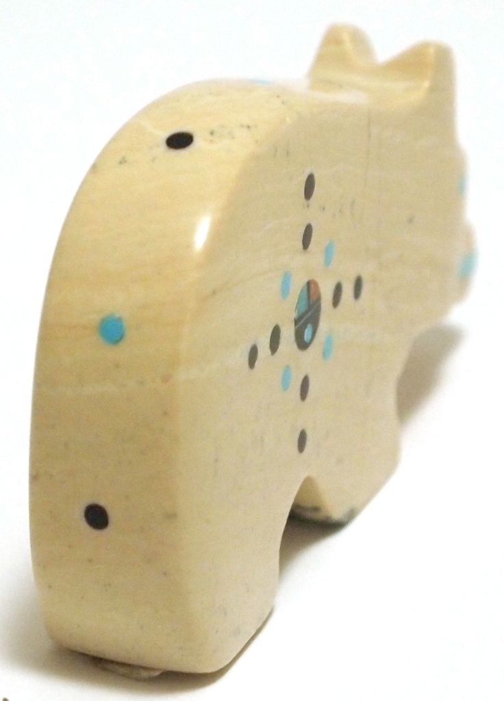 Measures 1-1/4" tall by 3/8" wide by 2-1/4" deep. Bear has turquoise eyes & mouth; Black Jet, Coral & Turquoise heart line, sun face and dot accents.