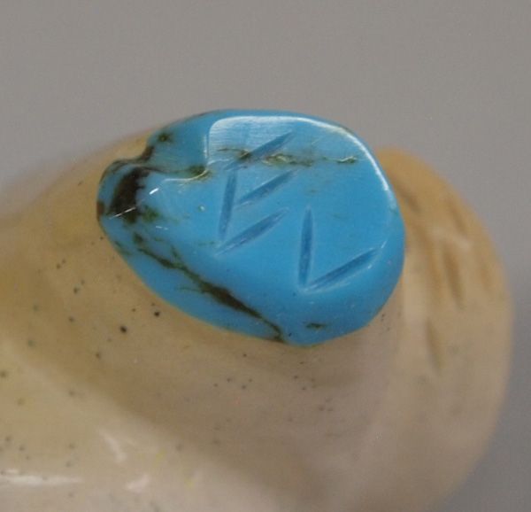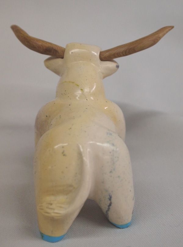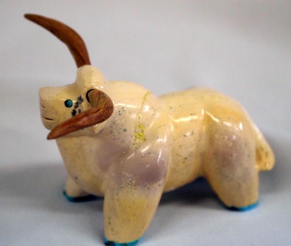 Native American Zuni Fish Rock Bull Fetish - Enrike Leekye. Bull has turquoise eyes and turquoise on the bottom of the feet and removable wood horns. Measures approx. 2 1/2''H x 3 1/4''L.