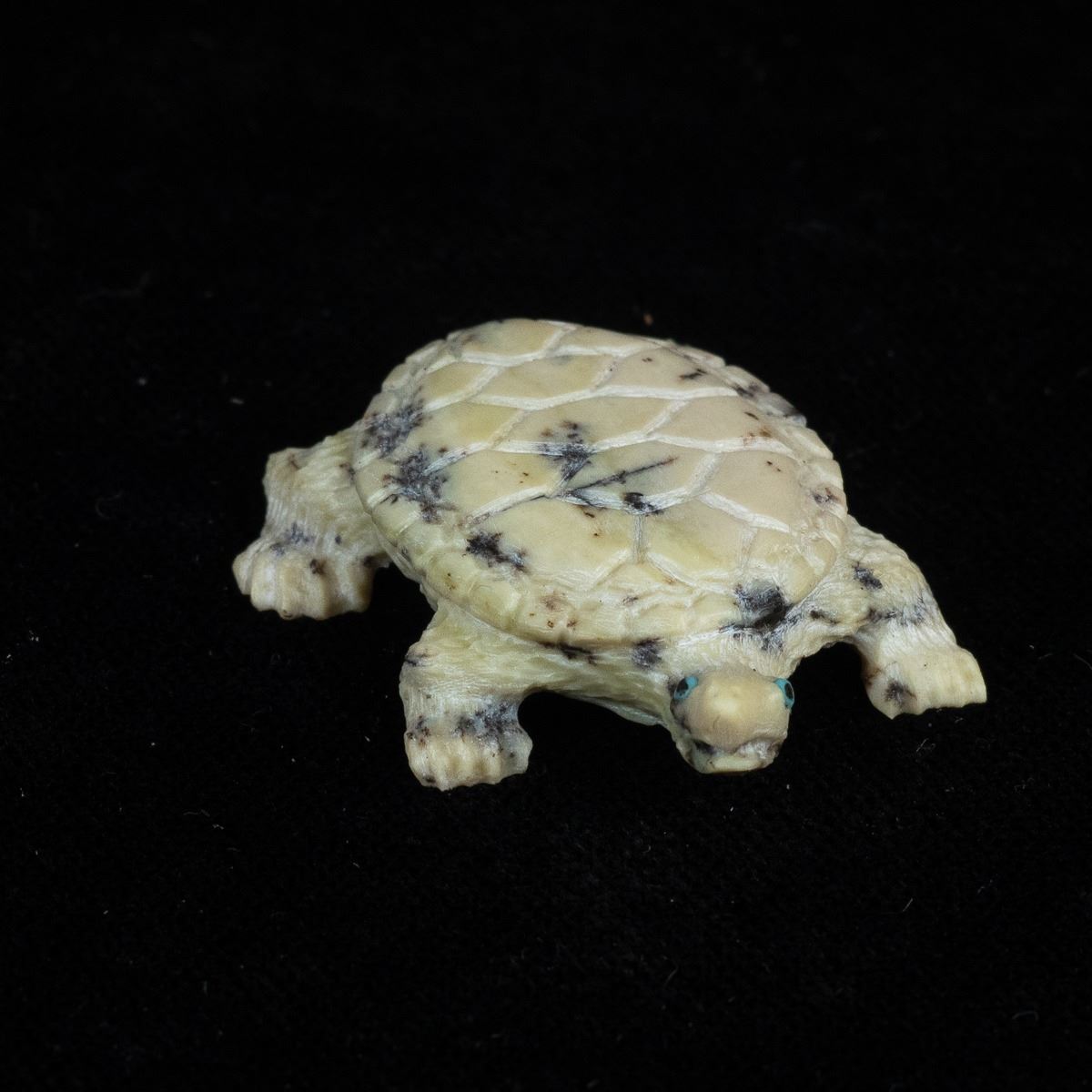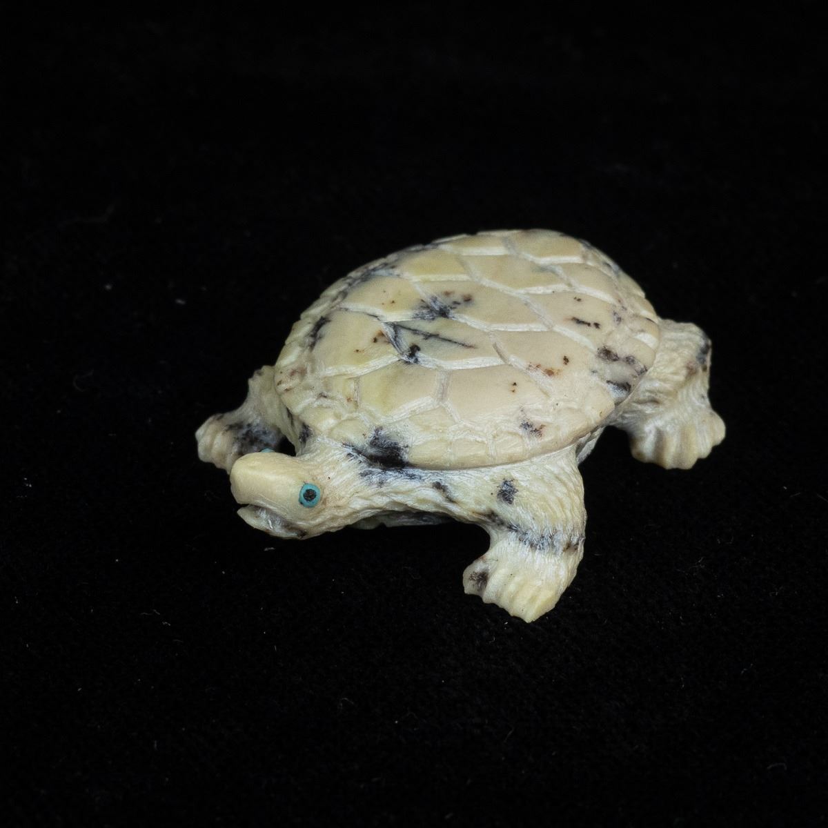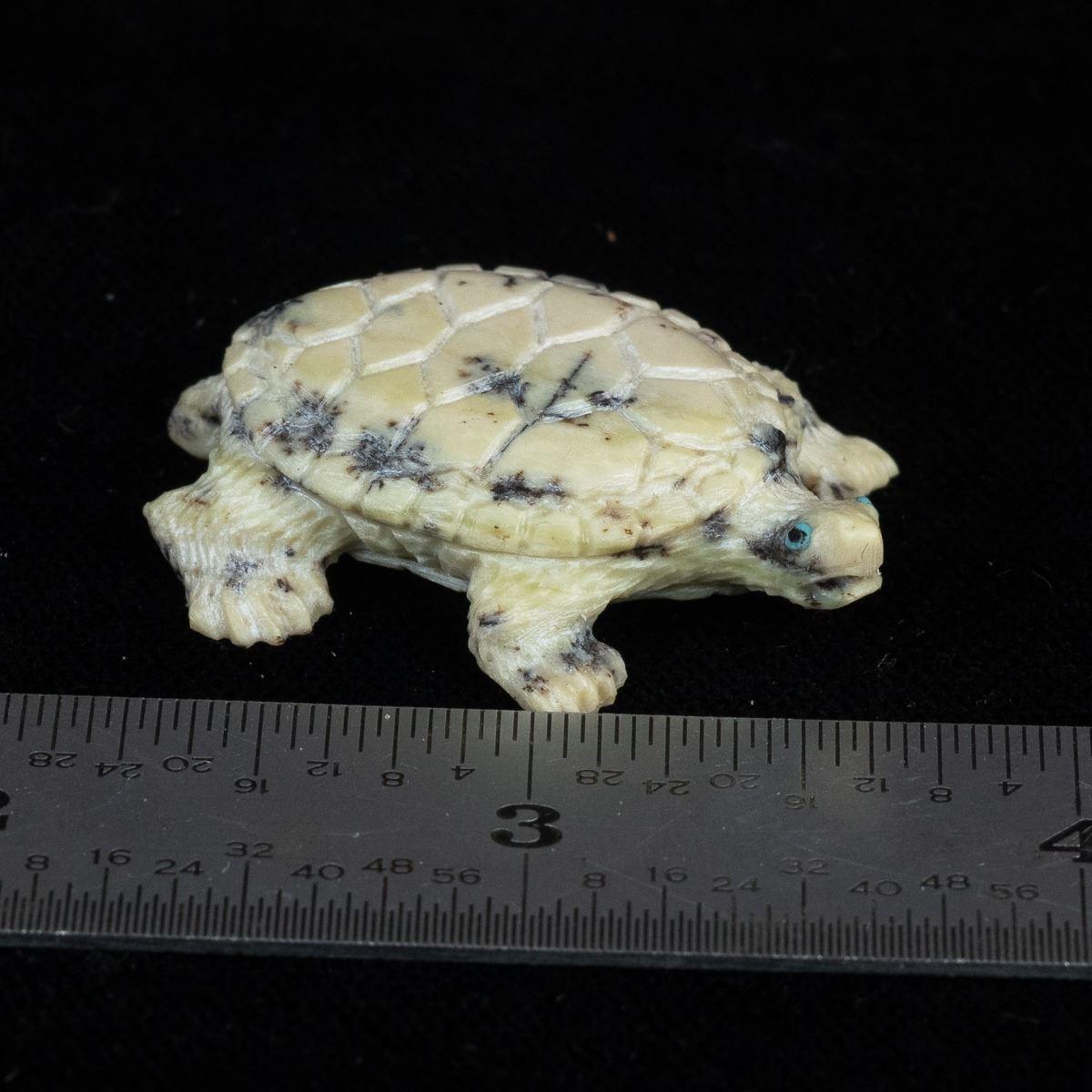 Native American Zuni Fishrock Turtle Fetish by Travis Lasiloo, measures 1'' x 1.5'' and is signed on the bottom, turquoise eyes