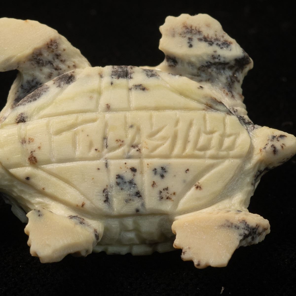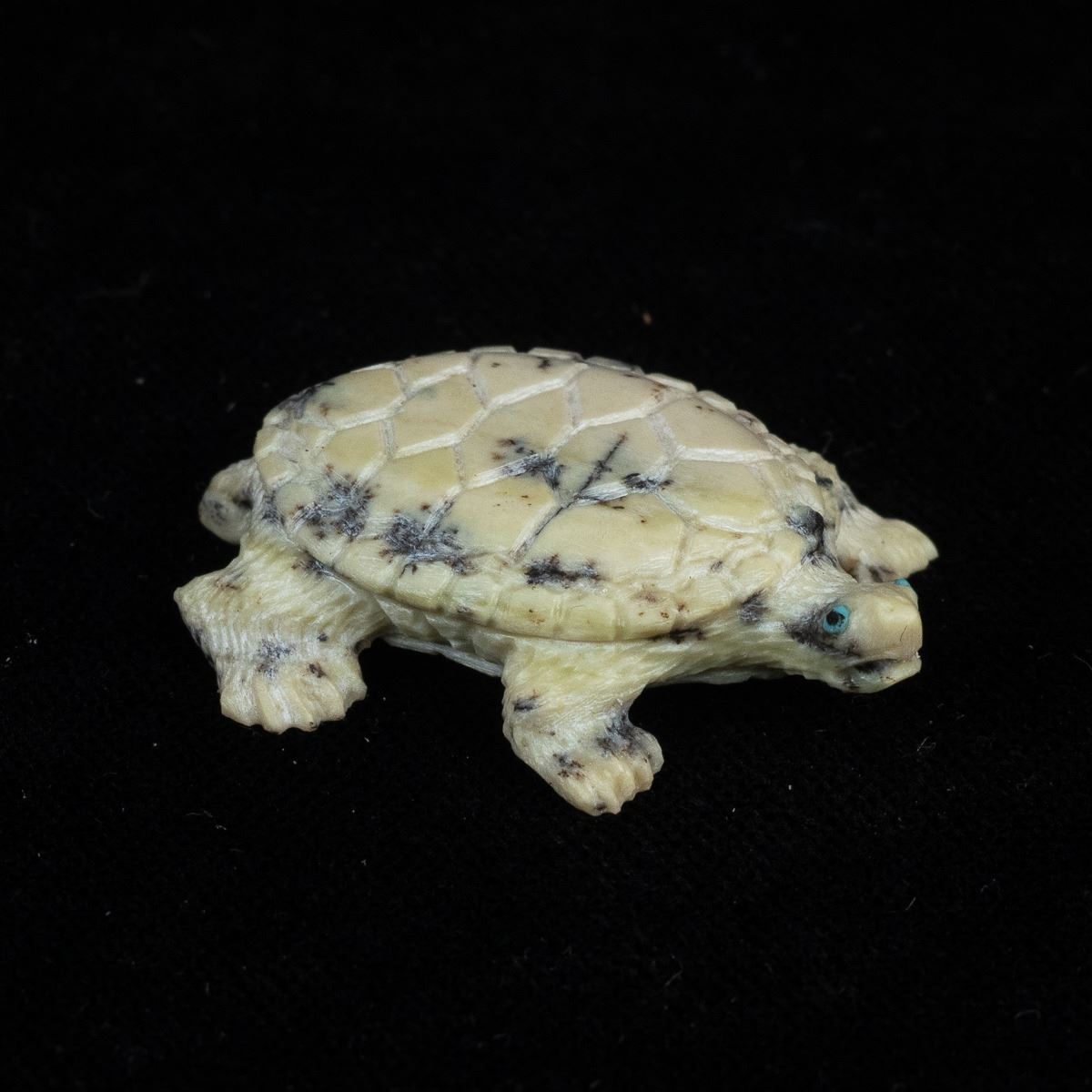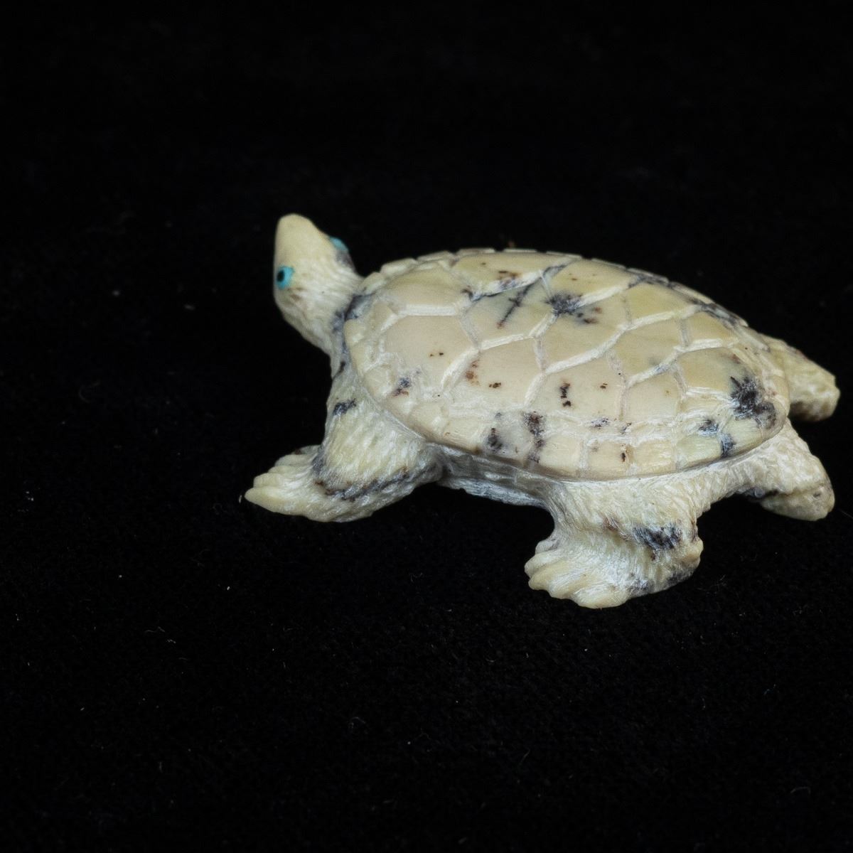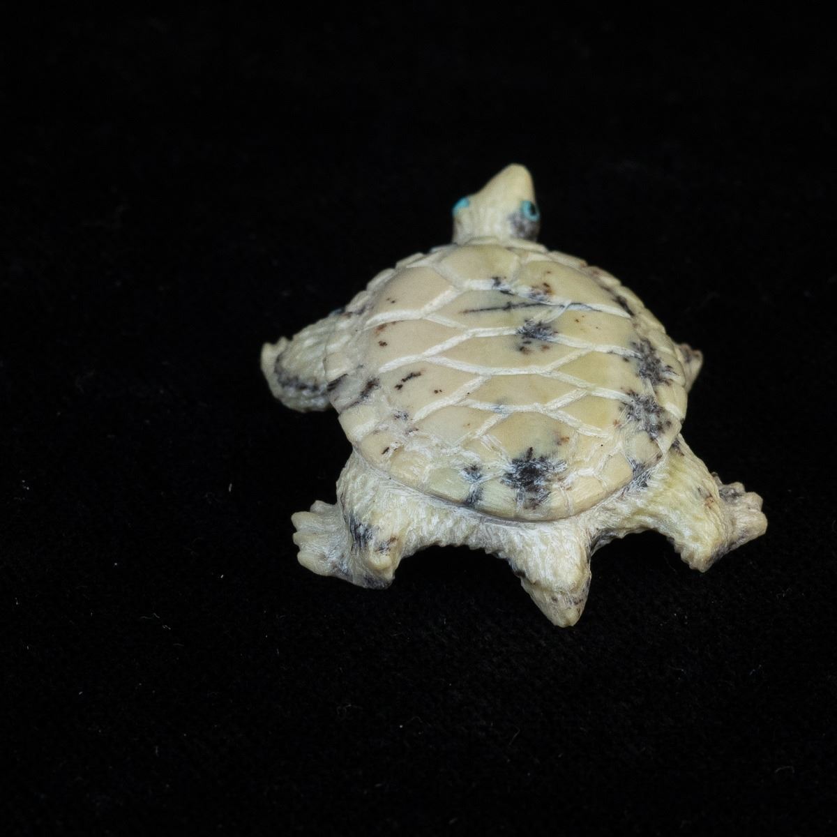 Native American Zuni Fishrock Turtle Fetish by Travis Lasiloo, measures 1'' x 1.5'' and is signed on the bottom, turquoise eyes