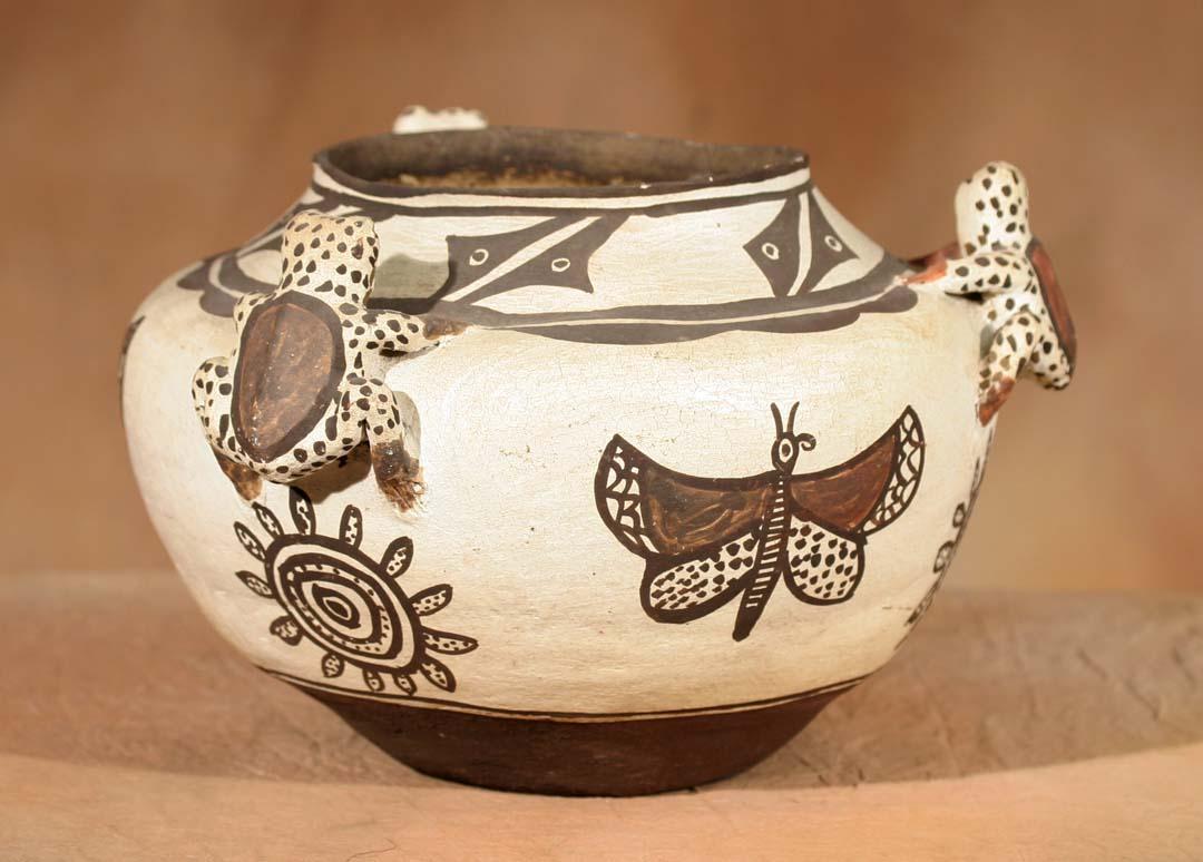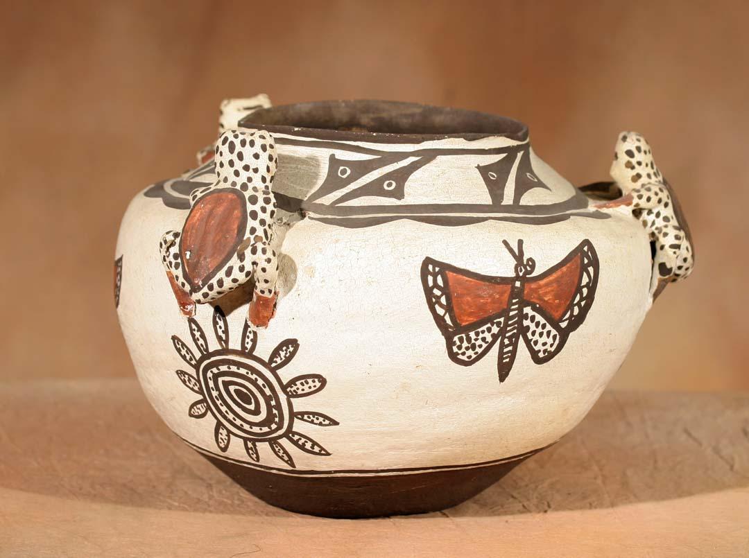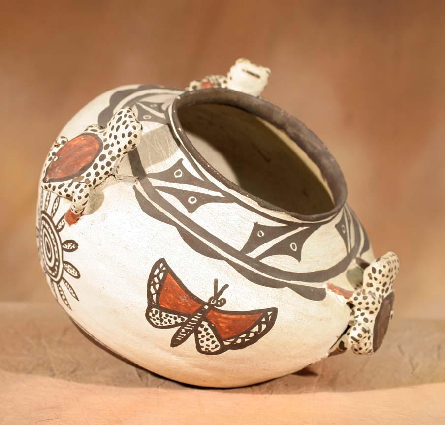 Zuni Frog Jar . 9" x 11". Butterfly designs with three applied frogs. Circa 1900. (est $5,000-7,000). Provenance: Bethany College, Lindsborg, KS. For condition reports please visit: www.auctioninsantafe.com/cr2011.pdf