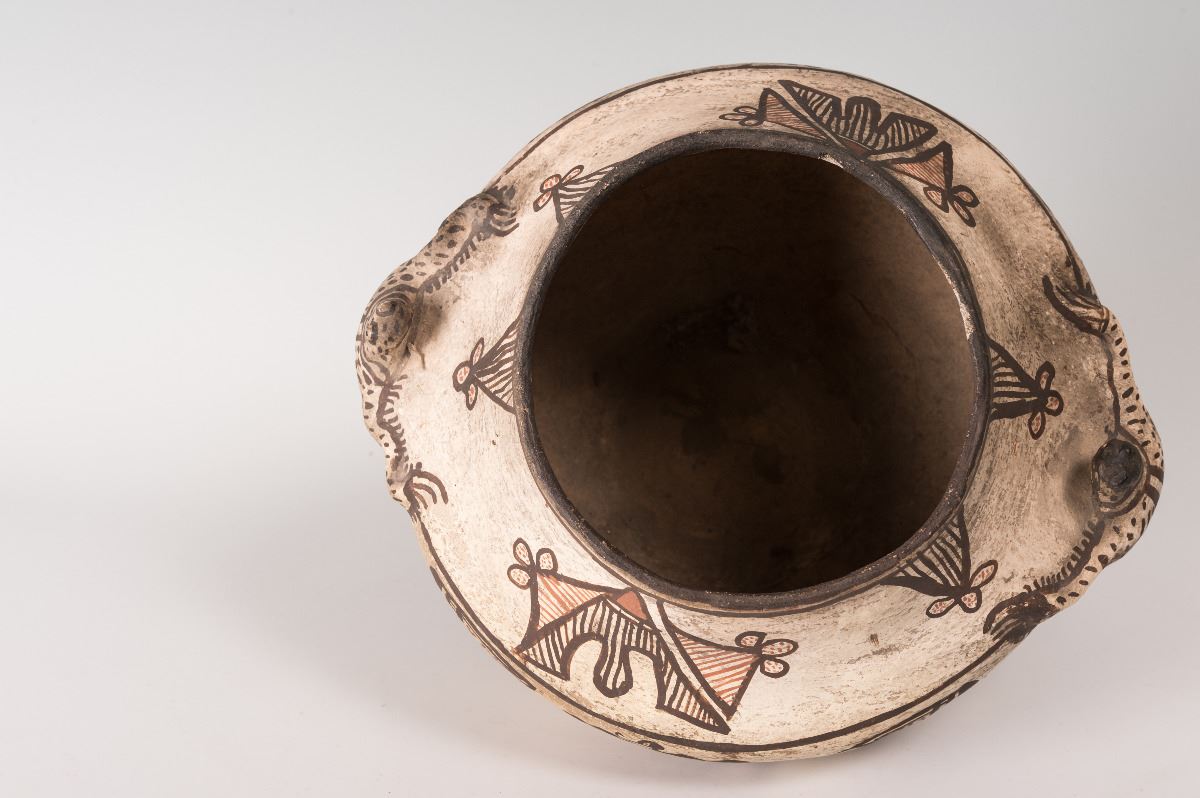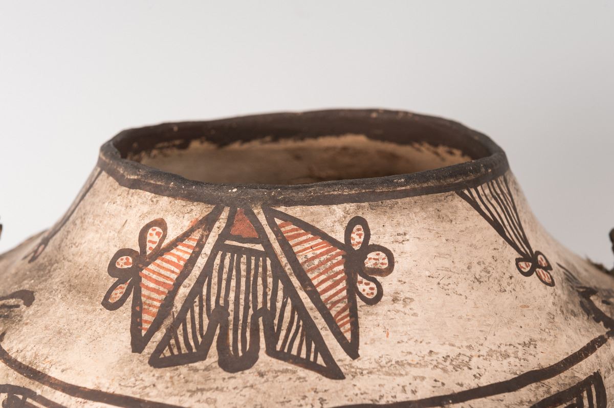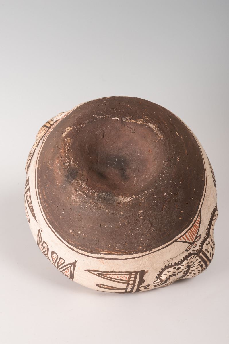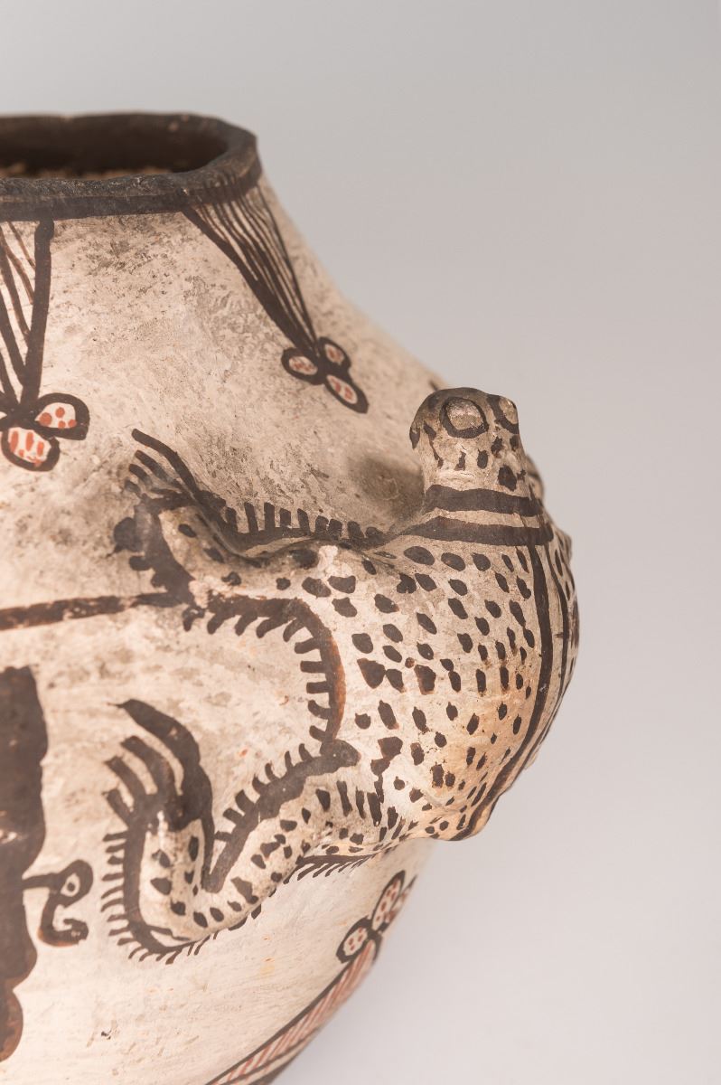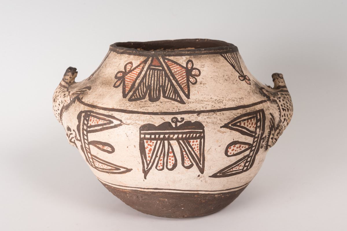 Zuni Frog Pot . 11 ½" x 8 ½". Classic, stylized, frog ceremonial jar with red and black designs on white slip. Circa 1880.